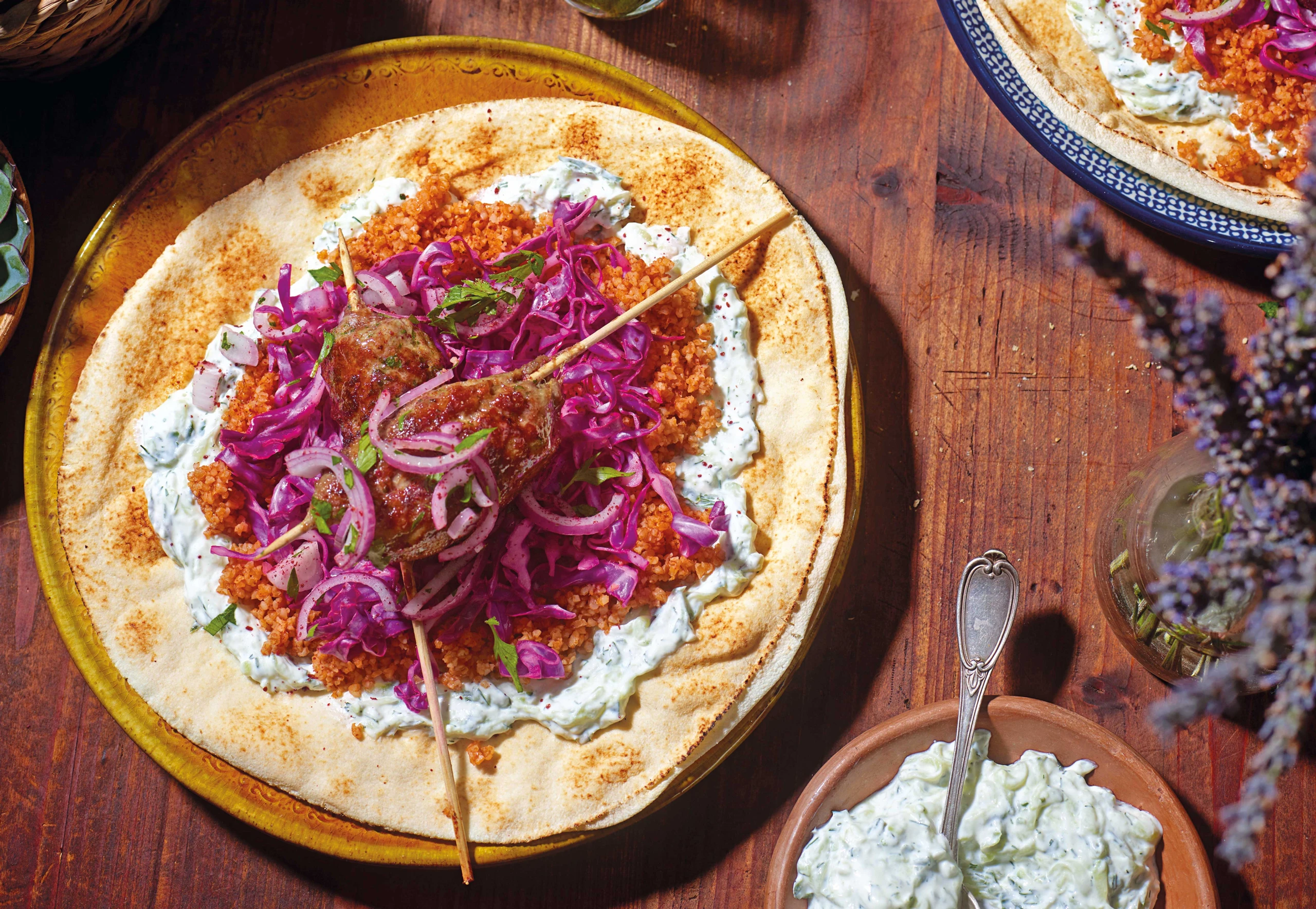 Köfte mit Bulgur, Cacik, Rotkraut, Sumachzwiebeln und Dürümfladen servieren.