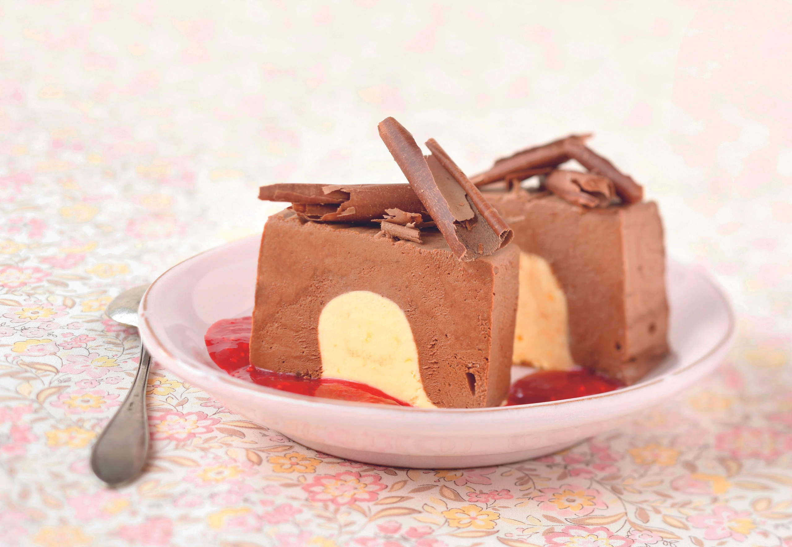 Mousse mit Frischhaltefolie zudecken und für mindestens 5 Stunden kühl stellen. Vor dem Anrichten Terrine aus der Form stürzen und die Folie entfernen. Terrine mit einem schmalen Messer in Scheiben schneiden. Messerblatt nach jedem Schnitt in warmes Wasser tauchen und trockenwischen. Terrine mit Schokoladespänen garnieren und mit der Himbeersauce servieren.