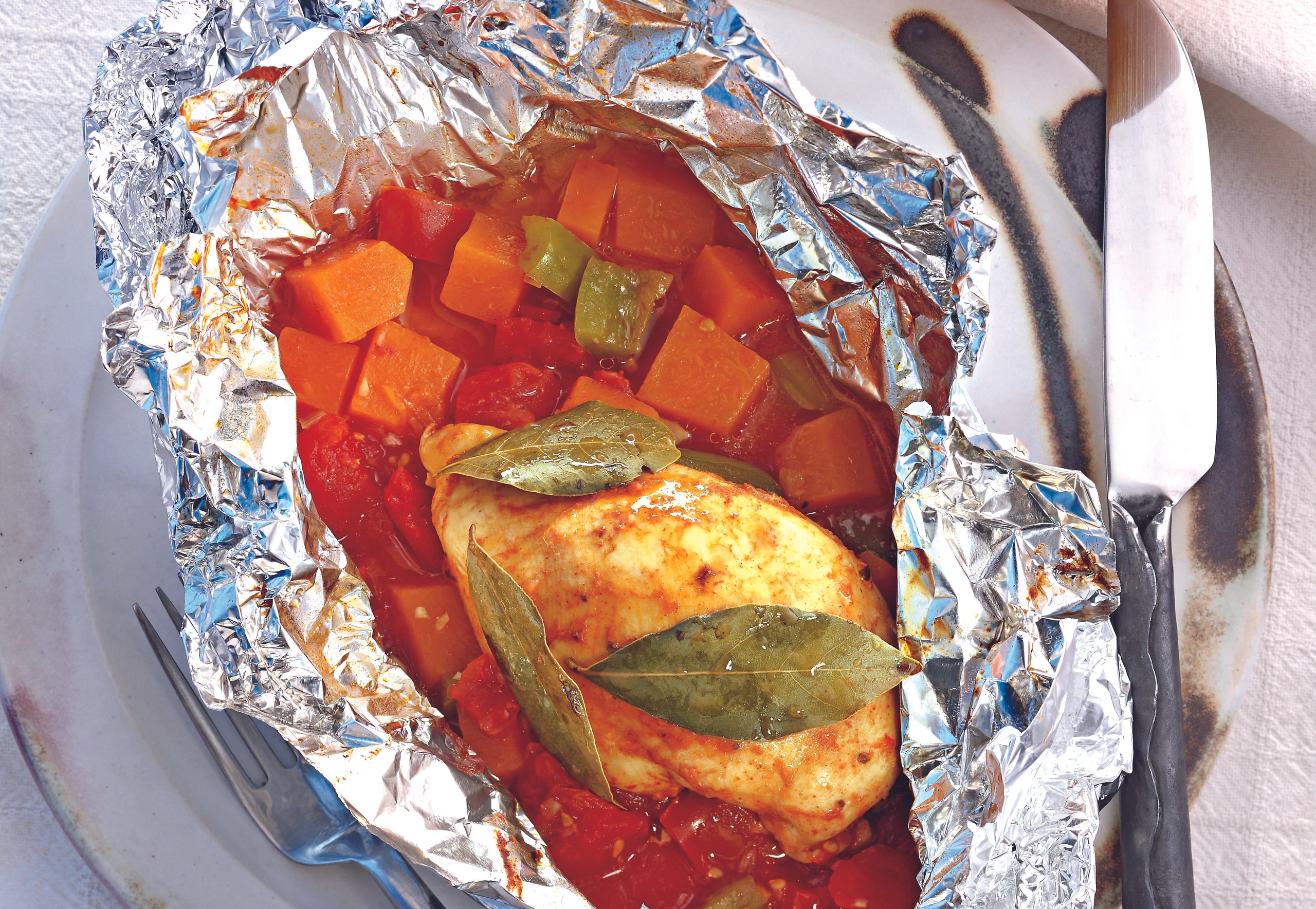 - Rohr auf 200°C vorheizen. Pro Päckchen 2 Stück Alufolie (30 x 40 cm) übereinanderlegen. In der Mitte das Gemüse verteilen, Fleisch und Lorbeer darauf-legen und mit Folie abdecken. Folie an den Längsseiten zusammenfalten und an den Enden fest zusammendrehen.