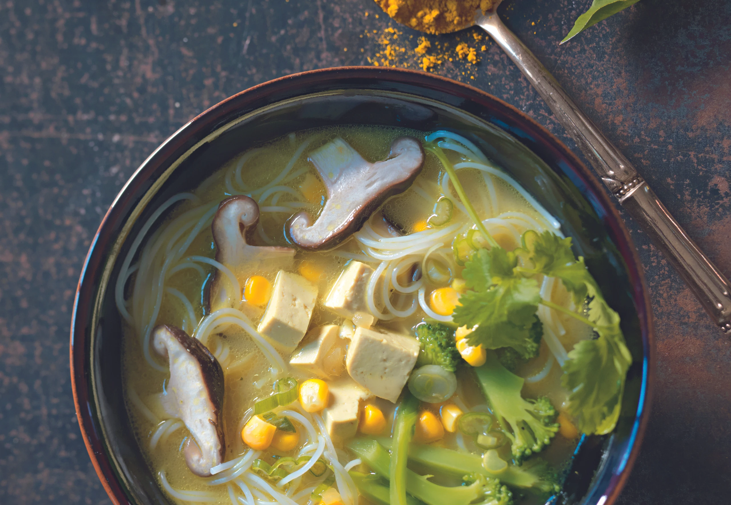 Pilze, Brokkoli, Mais und Tofu unterrühren. Suppe ca. 5 Minuten köcheln, mit Limettensaft und Salz abschmecken.