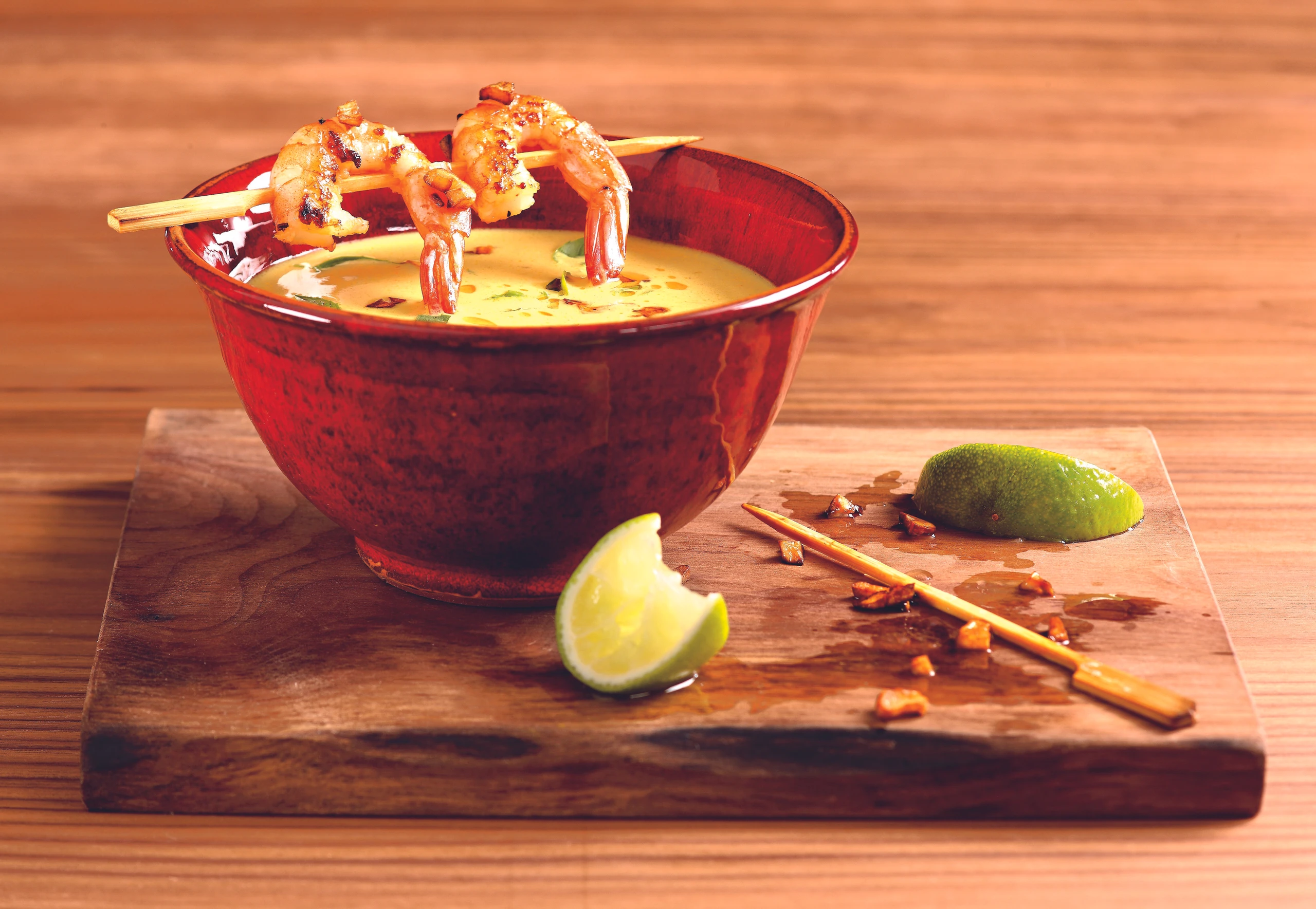Suppe salzen und durch ein Sieb gießen. Suppe in Schälchen gießen, eventuell mit Limettenspalten und Thai-Basilikum anrichten, mit Sesamöl beträufeln. Spieße über die Schälchen legen.