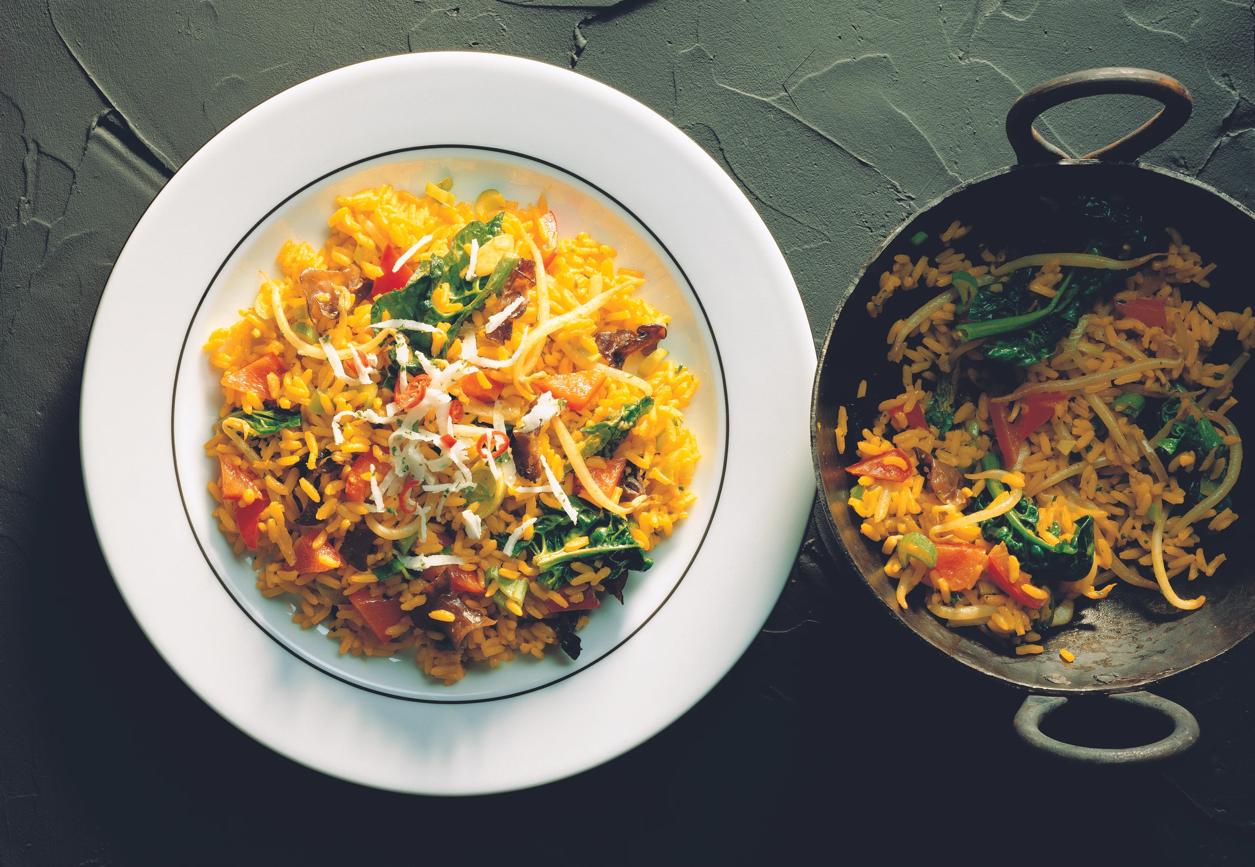 In einem flachen Topf 2 EL Öl erhitzen, Zwiebeln und Knoblauch darin glasig dünsten, dann unter Rühren goldgelb braten. Currypulver zugeben, kurz mitrösten, Reis zugeben und unter Rühren glasig anbraten. Suppe zugießen und aufkochen. Den Reis zudecken und ca. 40 Minuten dünsten, wenn nötig, wenig Suppe nachgießen.