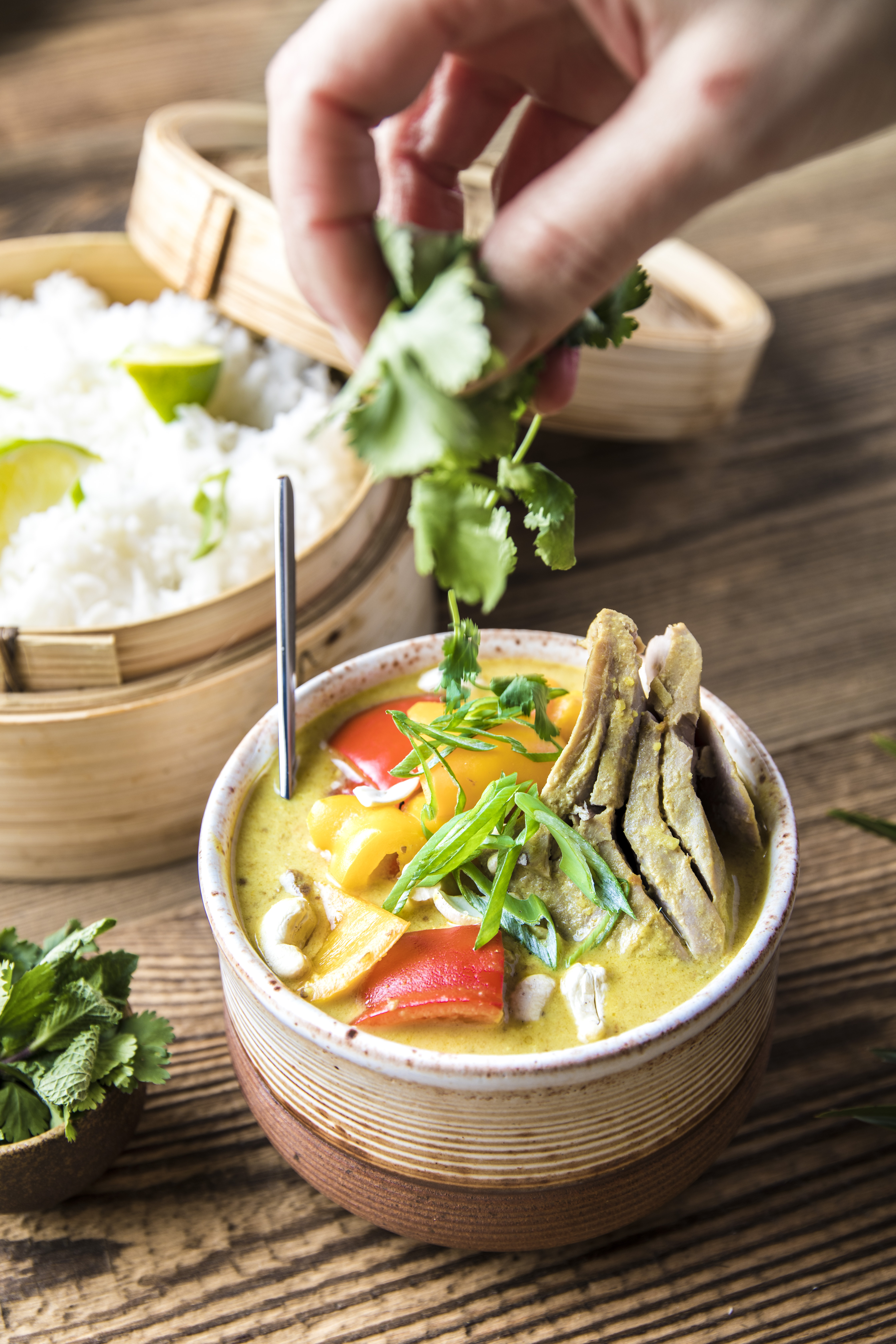 Thunfisch waschen, trockentupfen und in große Stücke schneiden. Fisch in das Curry legen und weitere 10 Minuten köcheln. Koriander und Minze abzupfen, Curry damit bestreuen. Dazu passen Hummerchips.