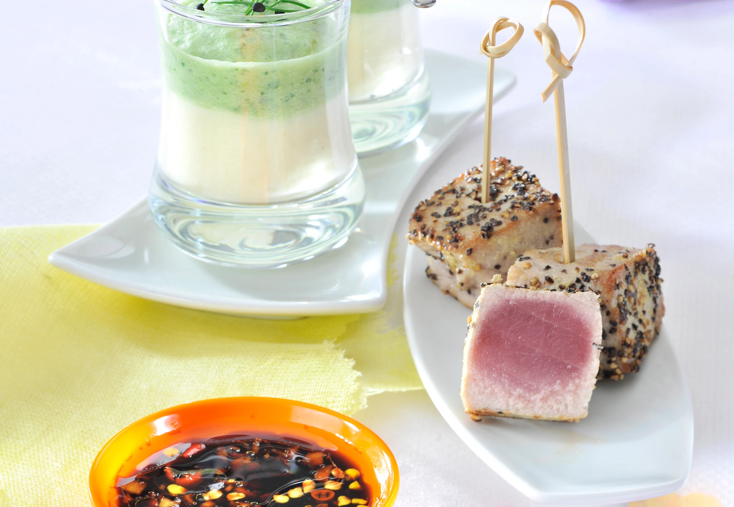 Thunfischwürfel auf Spieße stecken und mit dem Dip servieren.