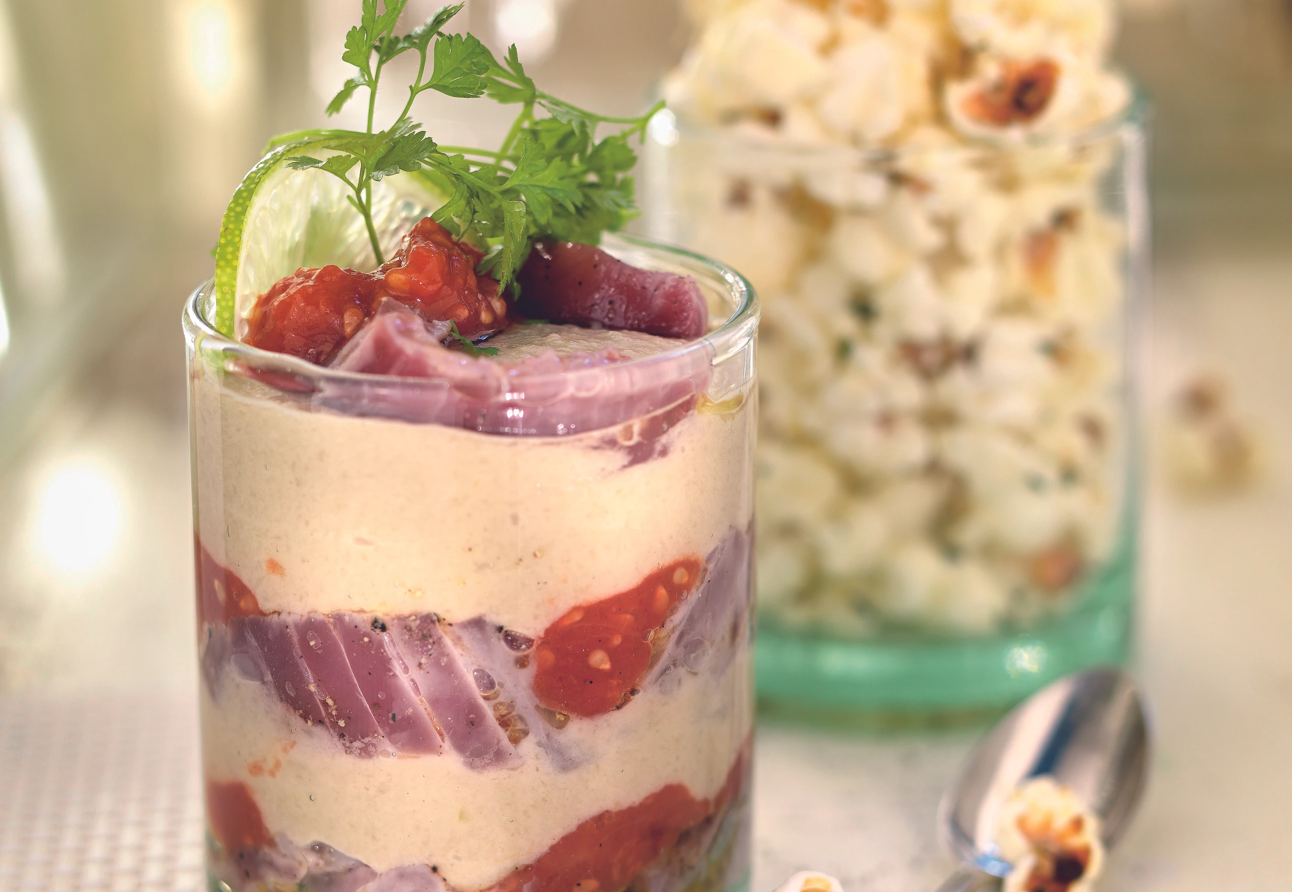 - Thunfischscheiben, Paradeis-Marmelade und Schalotten-Creme abwechselnd in Gläser schichten, mit Limettenscheiben und Kerbel garnieren und mit dem Popcorn servieren.