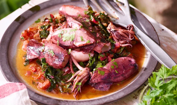 - Mangold- und Petersilblätter fein schneiden und am Ende der Garzeit untermischen. Tintenfische mit Salz und Pfeffer abschmecken. Auskühlen lassen.