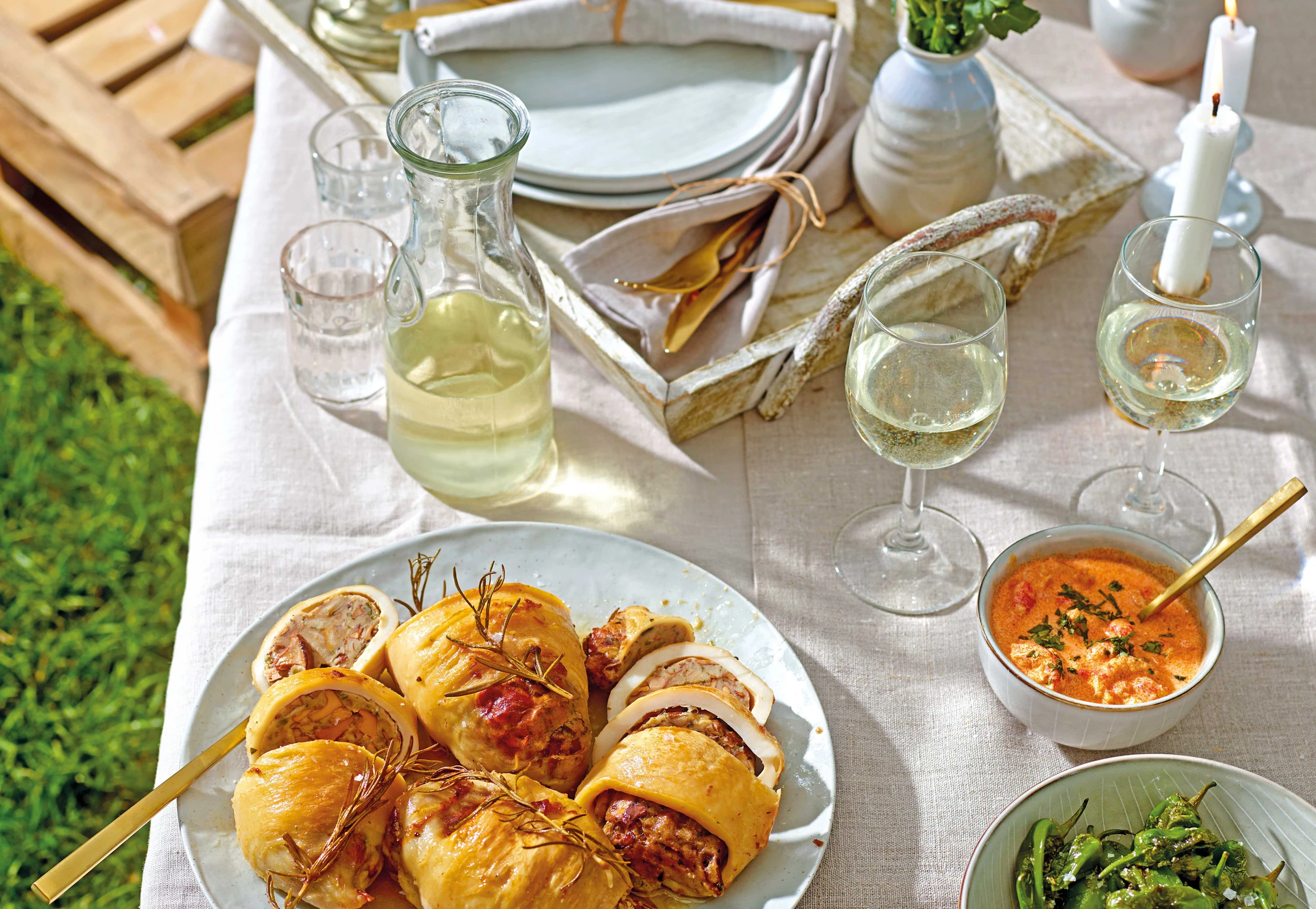 In einer Pfanne übriges Öl erhitzen, die Pimentos darin rundum scharf anbraten und mit Meersalz würzen. Tuben aus der Pfanne nehmen und warm stellen. Schmorfond auf ca. 50 ml einkochen, abseihen und in die Sauce rühren. Sauce mit Basilikum bestreuen. Tuben mit Sauce und Pimentos anrichten.