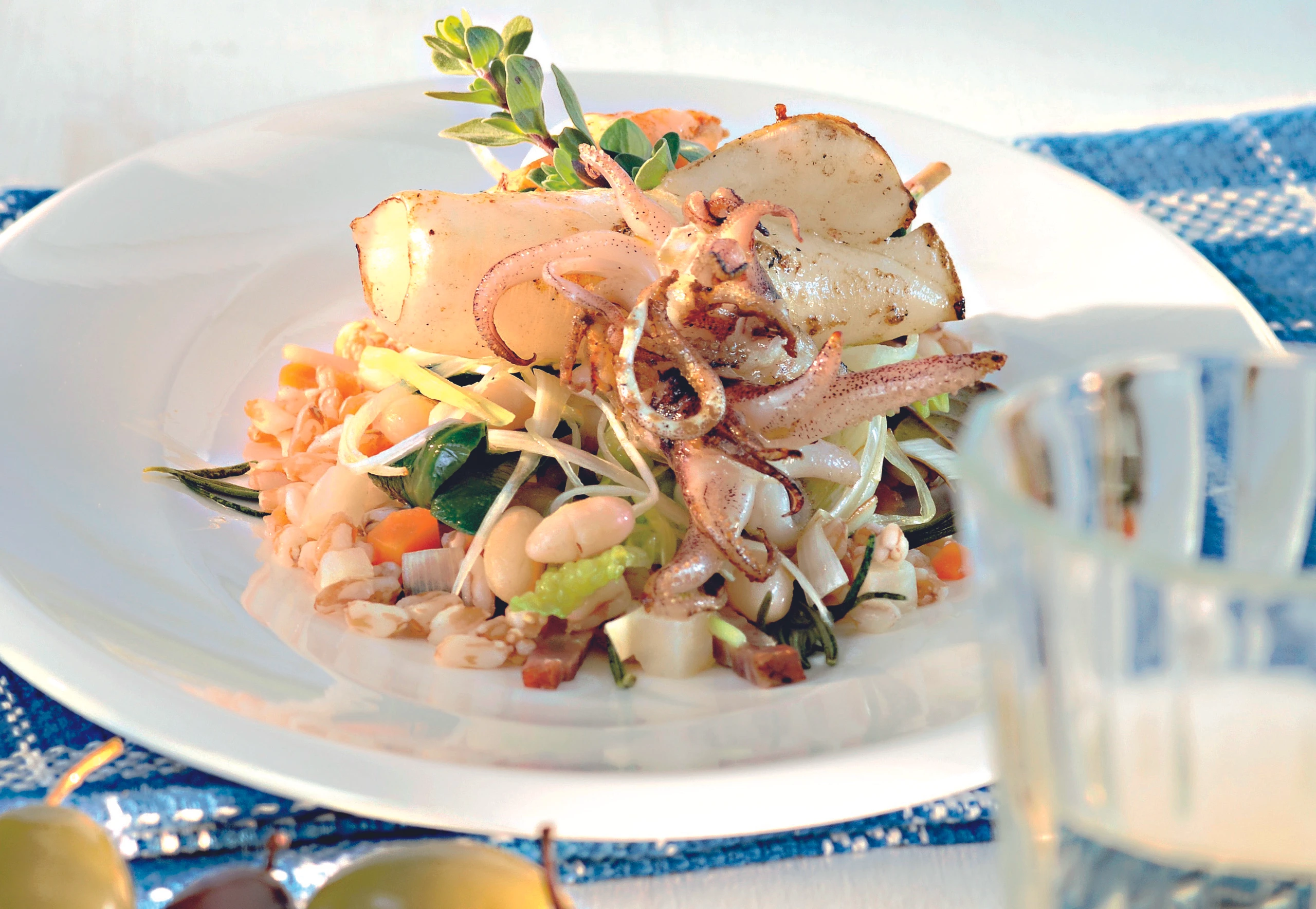 Wenig Öl erhitzen, Tintenfische darin bei guter Hitze goldbraun braten, salzen. Gran Pistau anrichten, Gemüse und Tintenfische darauf legen.