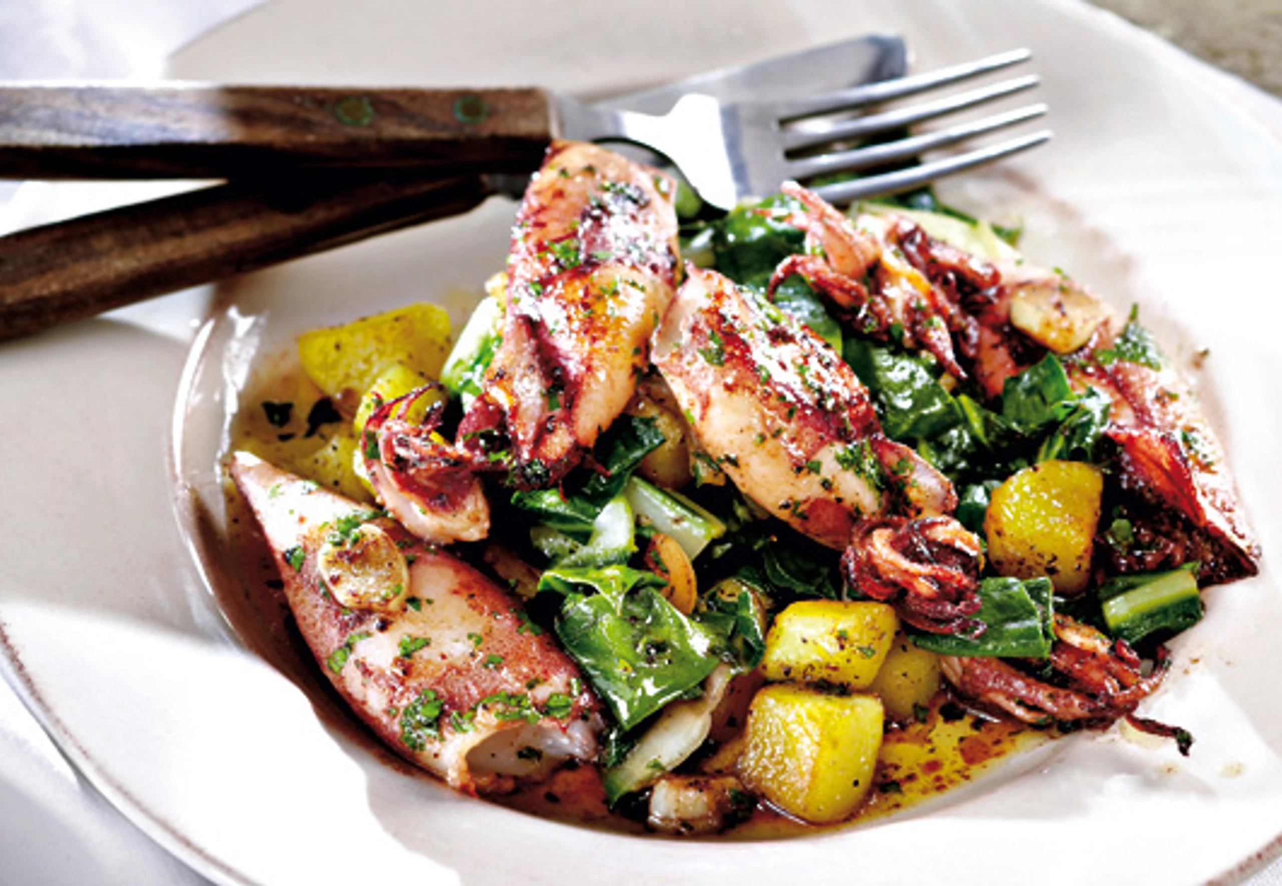 Tintenfische auf Küchenpapier abtropfen lassen. Grillpfanne mit Öl ausstreichen und erhitzen. Tintenfische darin rundum grillen (ca. 3 Minuten), auf Tellern anrichten, Knoblauch-Butter darauf verteilen und mit dem Mangold servieren.