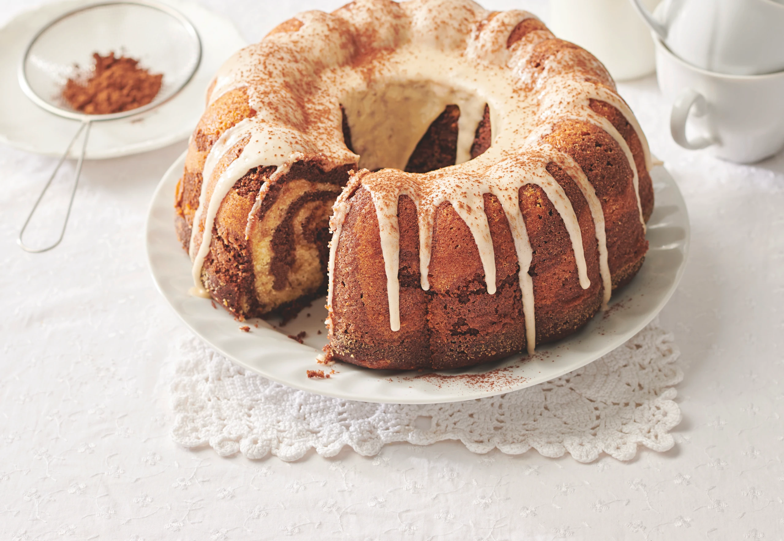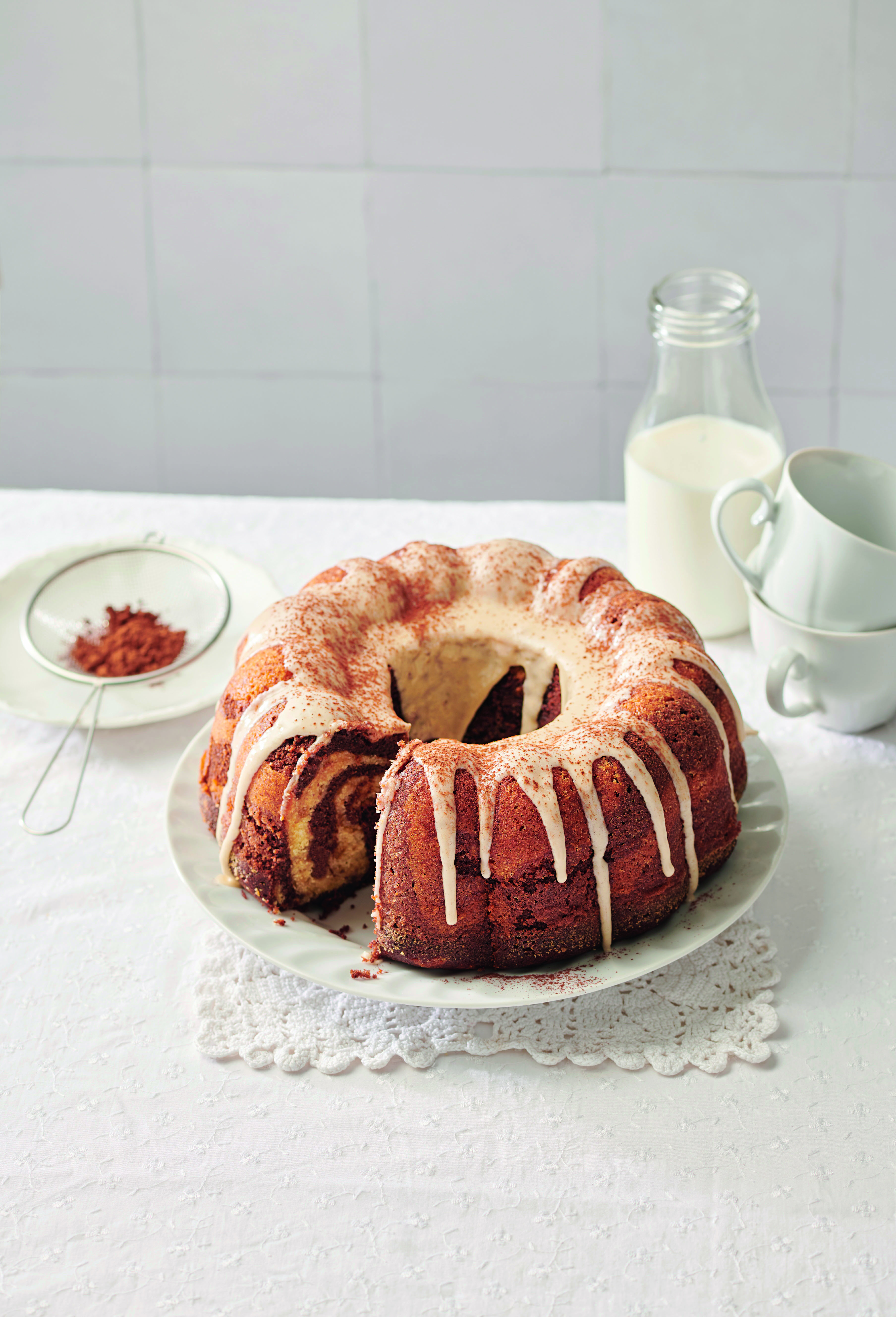 Für die Glasur Staubzucker und Kaffee verrühren. Gugelhupf damit beträufeln und mit Kakao bestreuen.