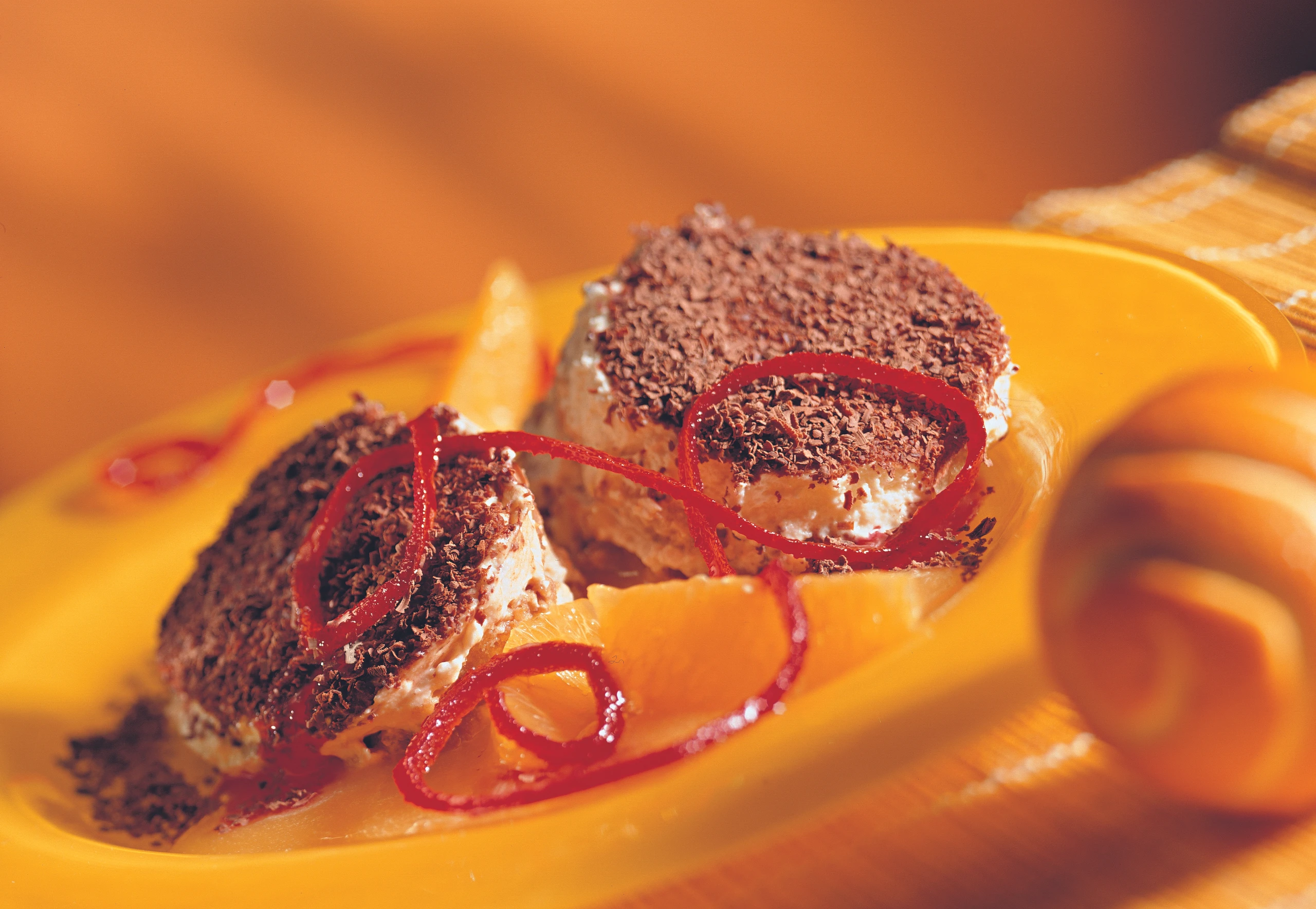 Aus dem Tirami sù gleichgroße Nocken ausstechen – Löffel vor jedem Nockerl in lauwarmes Wasser tauchen. Die Nockerln mit Orangensauce, Orangenfilets und Orangenstreifen anrichten.