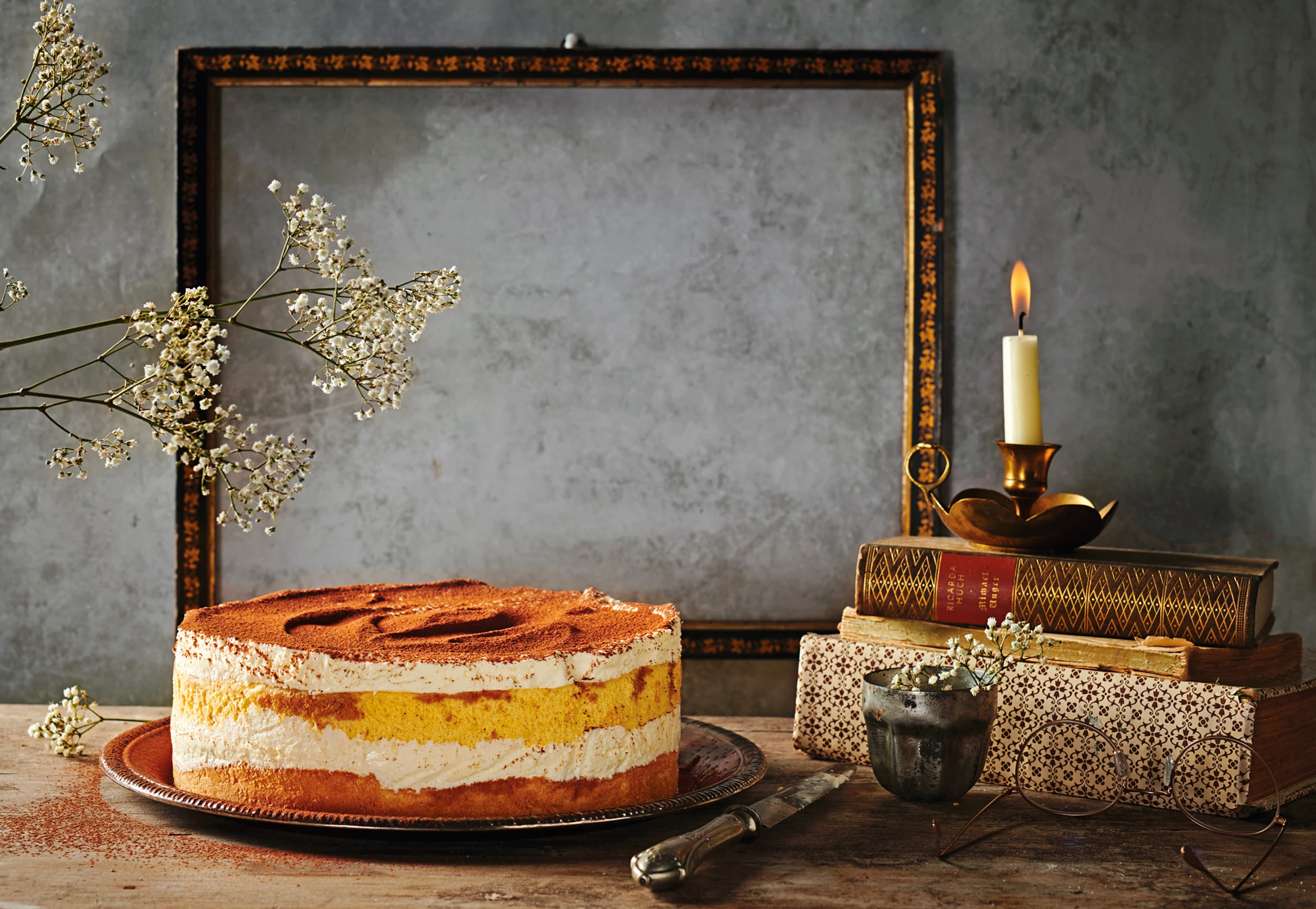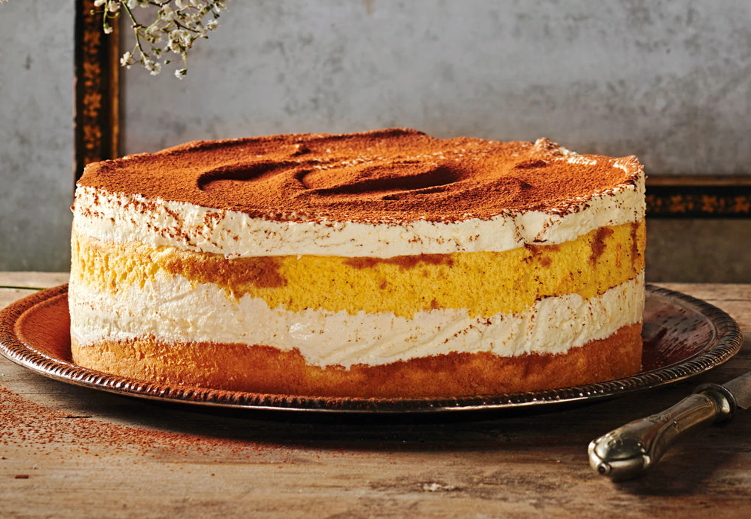 Tortenring auf den Servierteller stellen und mit Backpapierstreifen auslegen. Einen Biskuitboden einlegen. Espresso mit Rum vermischen (falls verwendet) und den Biskuitboden mit der Hälfte davon tränken. Die Hälfte der Creme darauf verteilen. Zweiten Biskuitboden darauf legen und mit der restlichen Espressomischung tränken. Übrige Creme darauf verstreichen. Torte für ca. 6 Stunden kalt stellen.