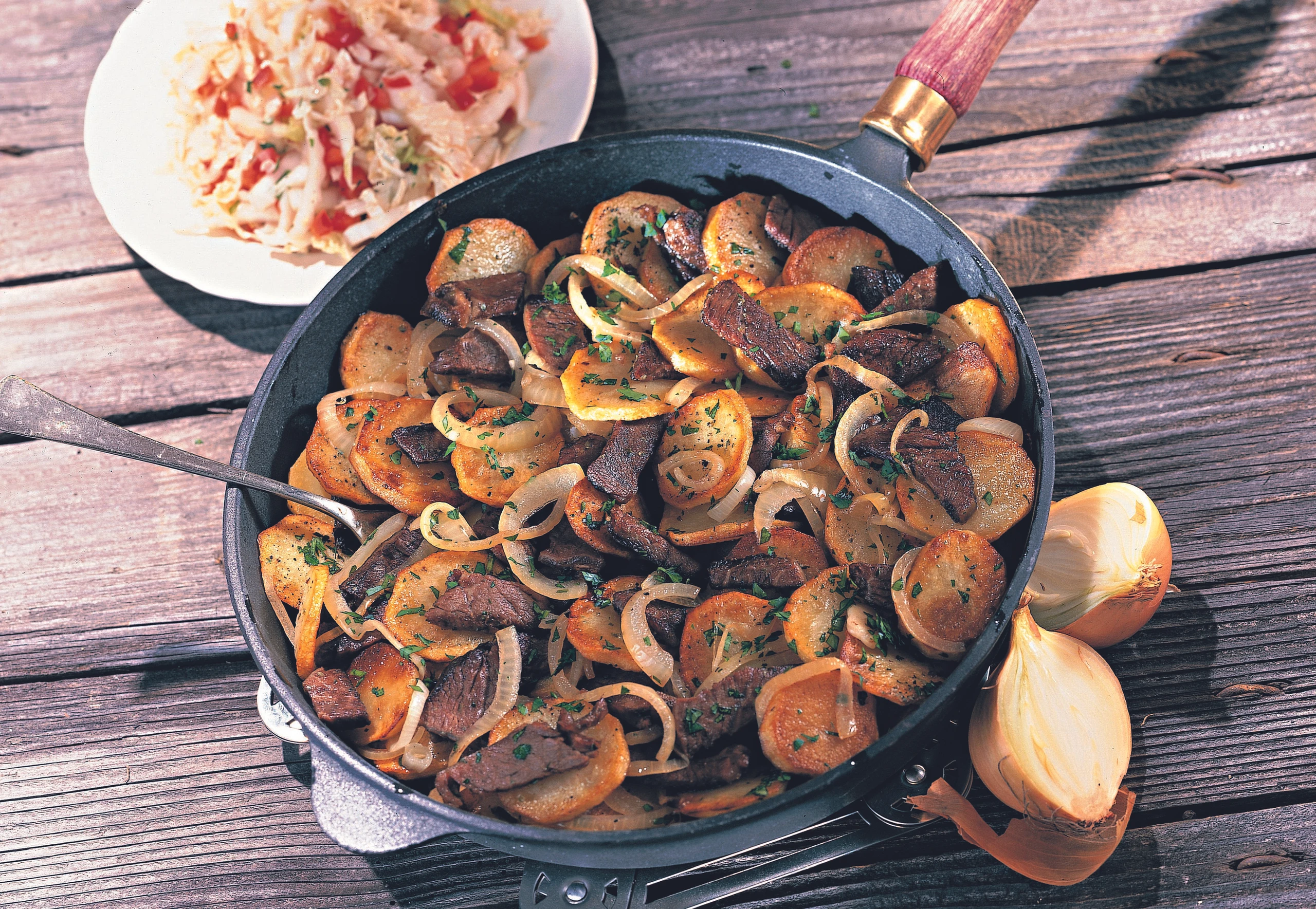 Ca. 4 EL Öl oder 2 EL Butterschmalz erhitzen. Erdäpfel darin anbraten, wenden und langsam fertigbraten. Erdäpfel aus der Pfanne heben und beiseite stellen.