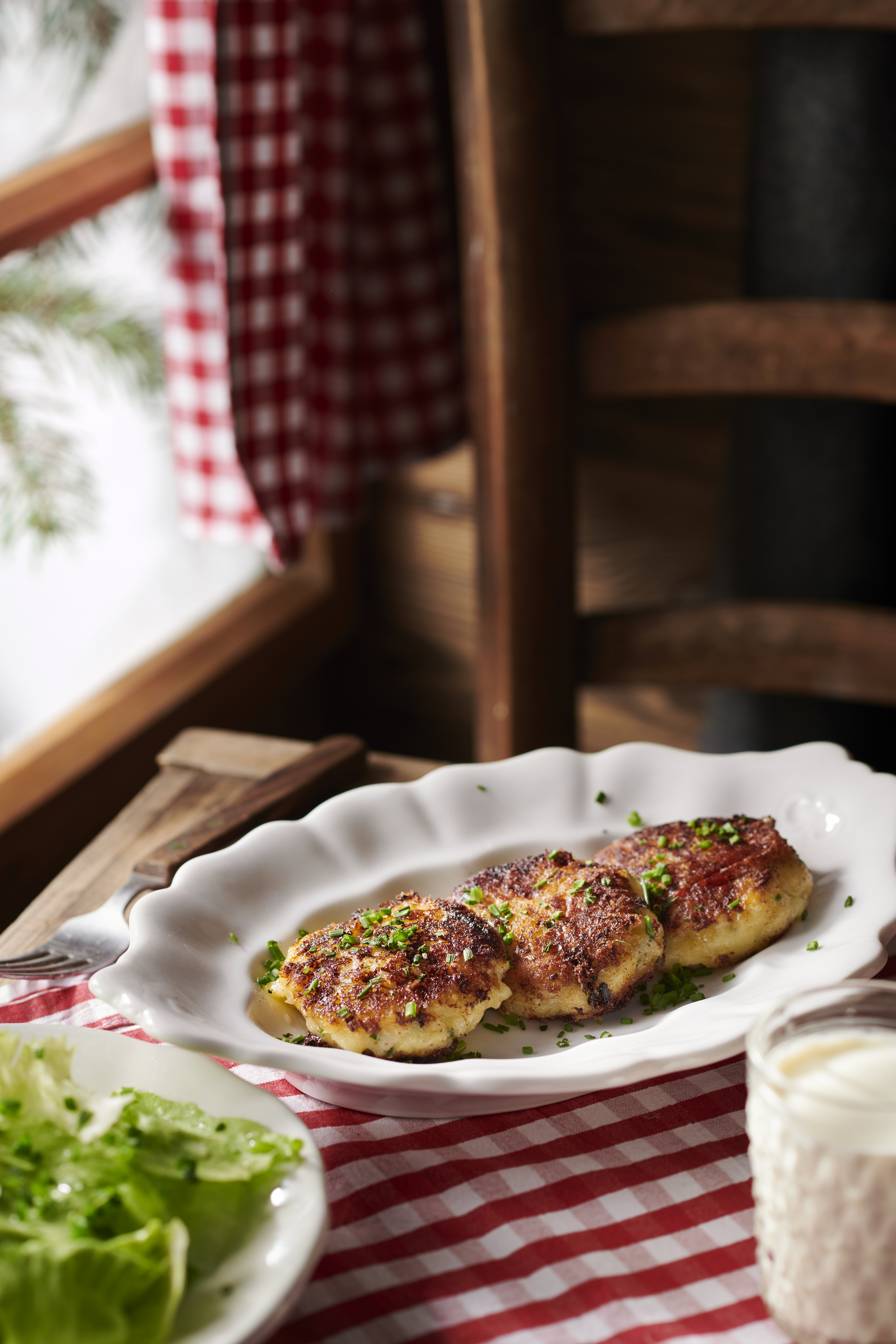 Erdäpfel schälen und grob reiben. Zwiebel schälen und fein würfeln. Käse in kleine Würfel schneiden. Erdäpfel, Zwiebel, Käse, Topfen und Mehl vermischen. Mit Salz und Pfeffer würzen, dann mit der Hand verkneten. Ist die Masse zu weich, etwas Mehl hinzufügen, ist sie zu fest, mehr Topfen beigeben. Mit nassen Händen Knödel formen und flach drücken.