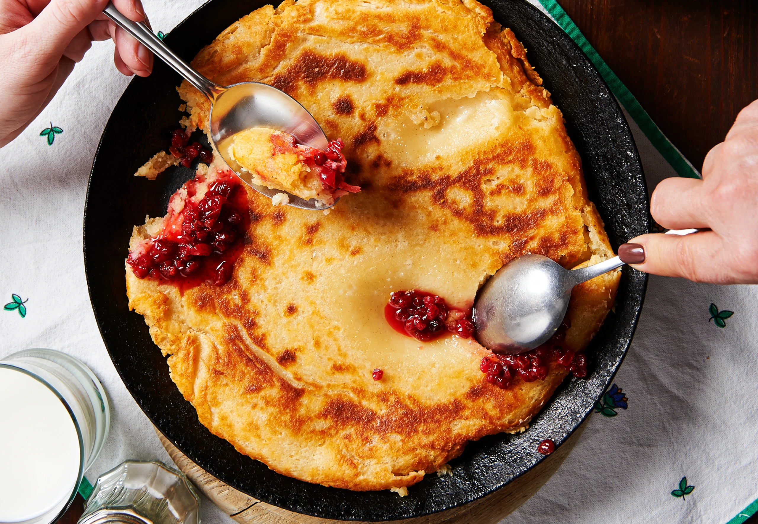 Restliche Butter in einer Eisenpfanne zerlassen und den Teig darin glatt streichen. Von beiden Seiten dunkel und knusprig backen.
