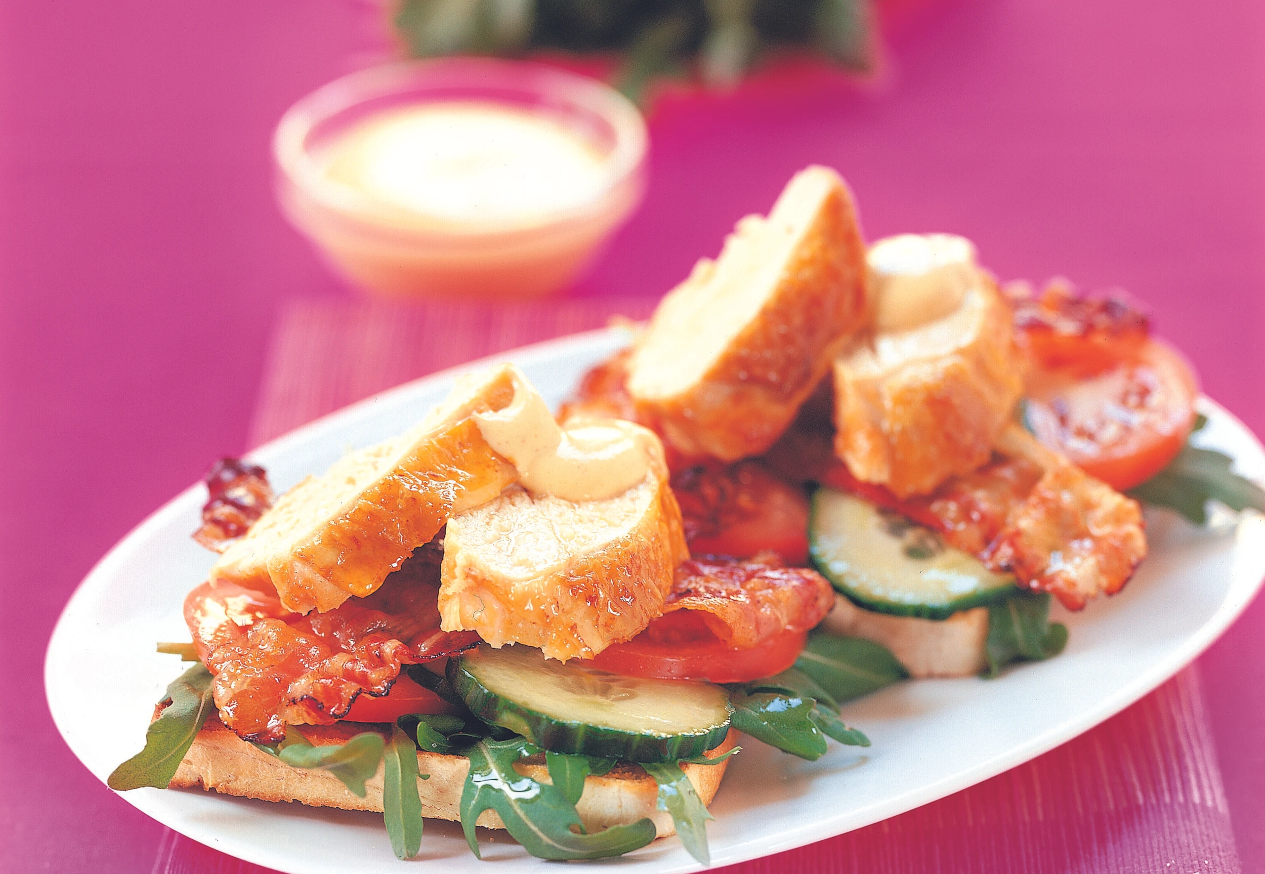 Brote toasten. Fleisch in Scheiben schneiden. Brote mit Rucola, Paradeisern, Gurken, Speck und Hühnerfilets belegen. Toasts mit der Sauce servieren.