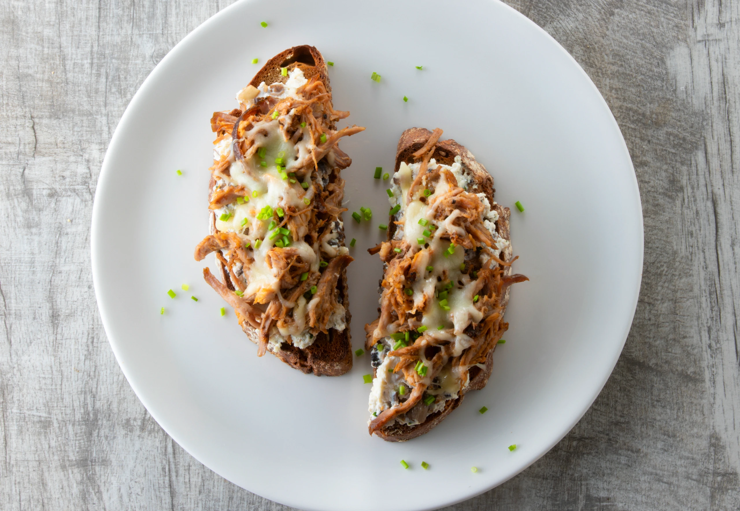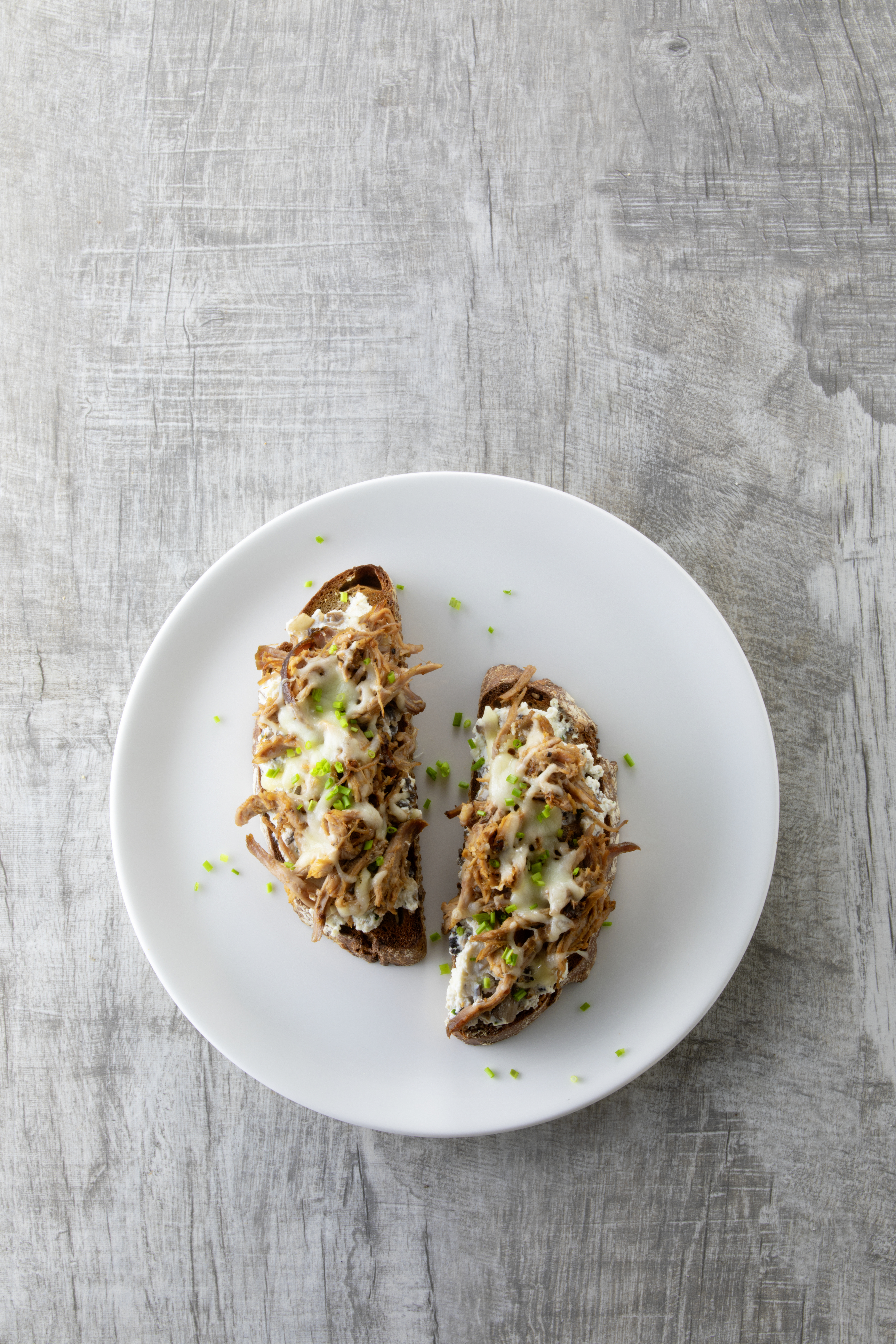 Brote mit Champignon-Ricotta bestreichen, Pulled Pork darauf verteilen und mit Mozzarella bestreuen. Brote im Rohr (obere Schiene / Gitterrost) überbacken, anrichten und mit übrigem Schnittlauch bestreuen.
