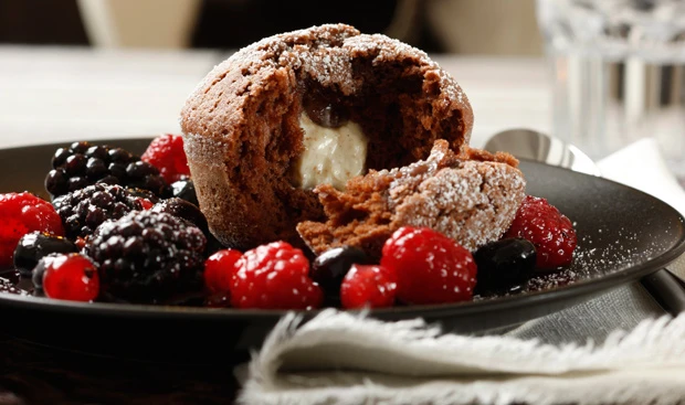 Vier Auflaufförmchen (Inhalt ca. 150 ml) vorbereiten. Mehl, Backpulver, Staubzucker und Kakao versieben. Butter, Vanillezucker und Ei zu der Mehlmischung geben und zu einer glatten Masse verrühren.