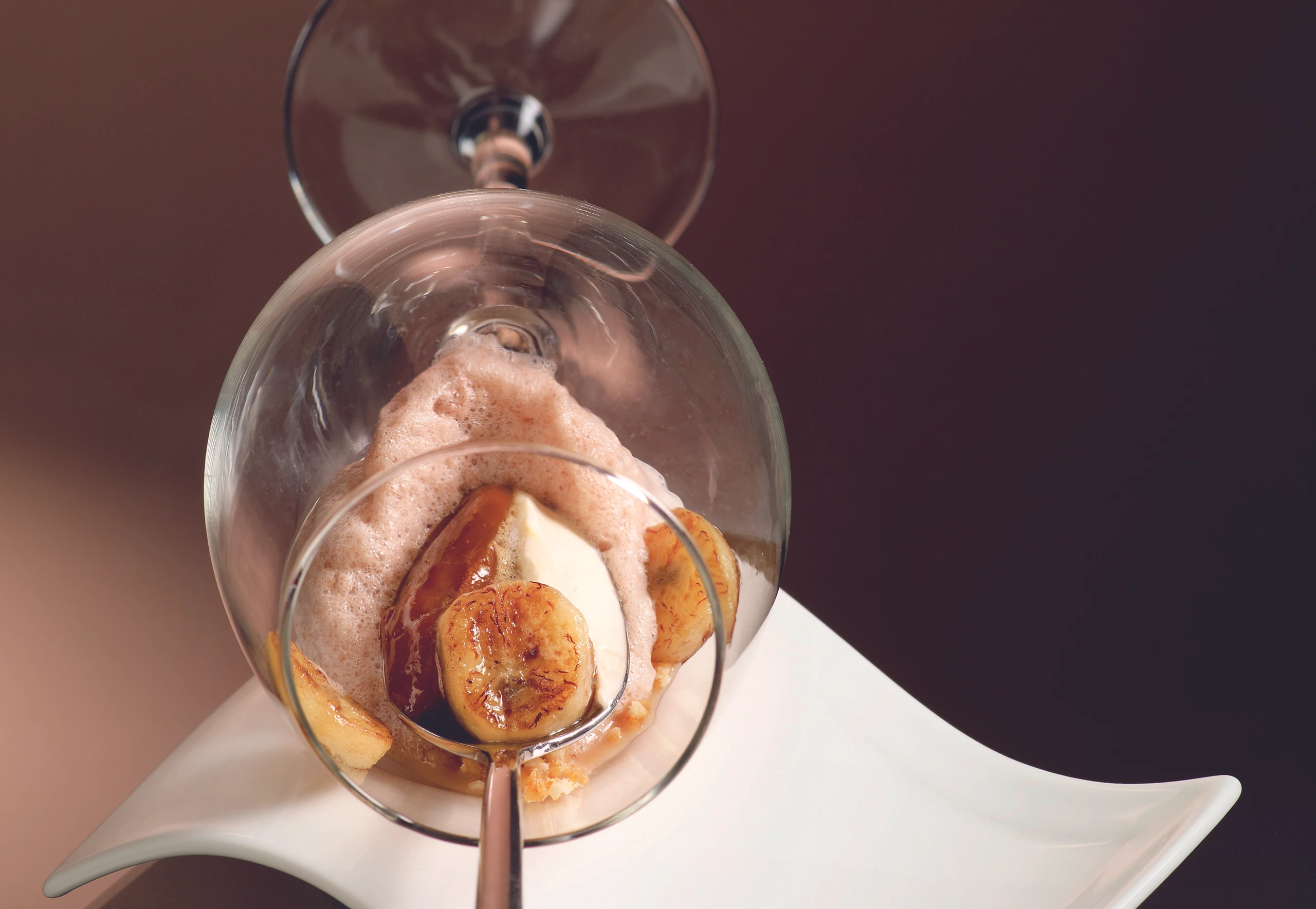 Banane schälen, in Scheiben schneiden, in Butter beidseitig kurz anbraten. Aus dem Eis und dem Frischkäse je 1 Nockerl ausstechen, mit Schokolade, Schokoladeschaum und Bananenstücken anrichten.