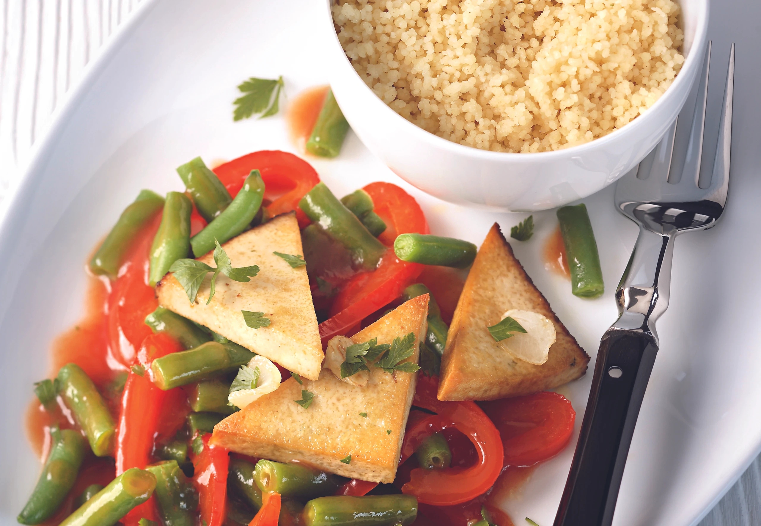 Ca. 125 ml Wasser mit Salz aufkochen und vom Herd nehmen. Couscous einrühren, zugedeckt ca. 5 Minuten quellen lassen. Knoblauch und Paprika in 1 TL Öl anbraten. Fisolen untermischen, kurz anrösten. Tomatenmischung zugießen, Petersilie einrühren. Tofu in einer beschichteten Pfanne kurz anbraten. Tofu und Gemüse mit dem Couscous servieren.