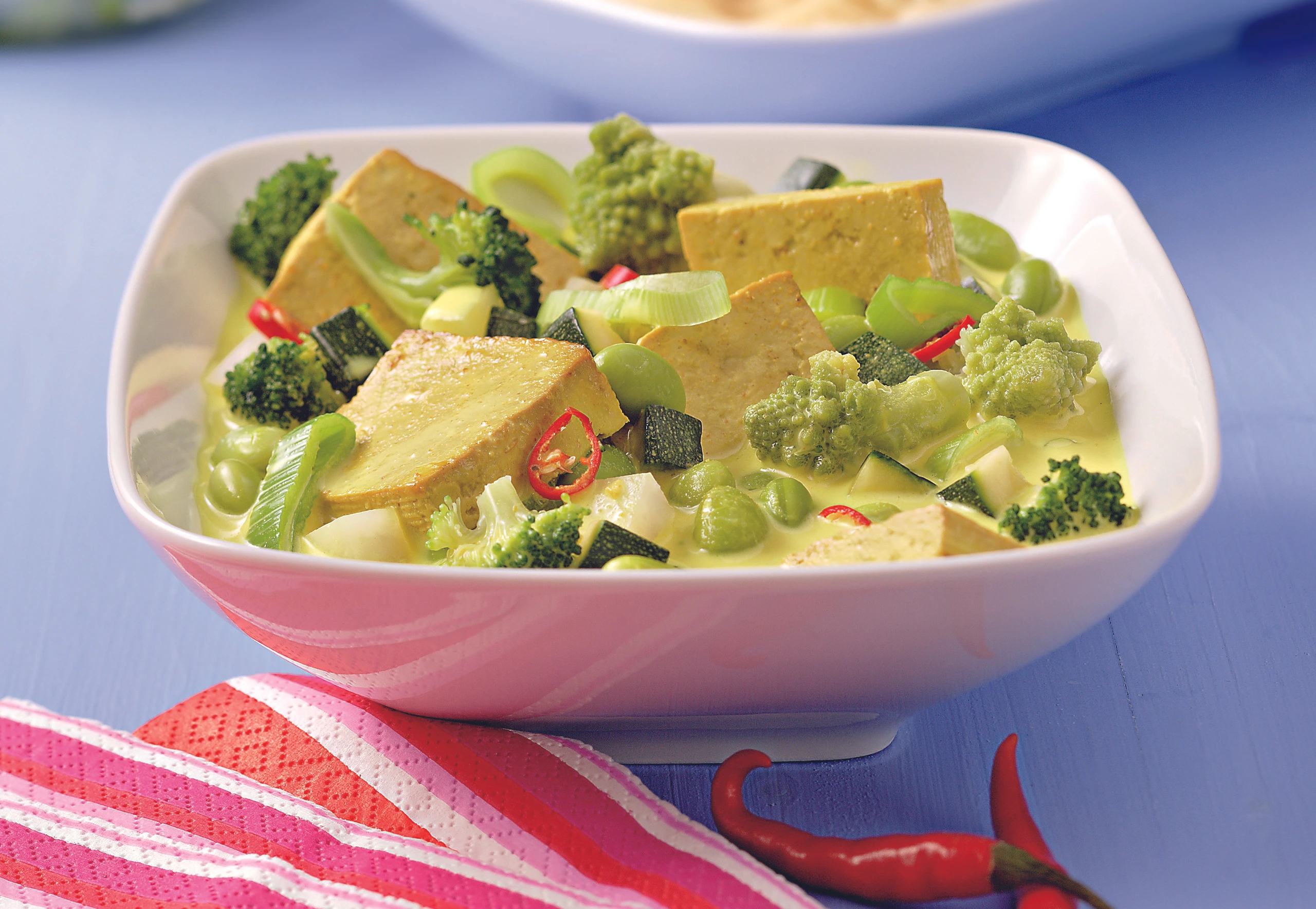 Tofu in kleine Stücke schneiden. Sojasauce, je 1 TL Knoblauch, Ingwer und Curry verrühren. Tofu mit der Marinade vermischen, zudecken und für 30 Minuten kalt stellen.