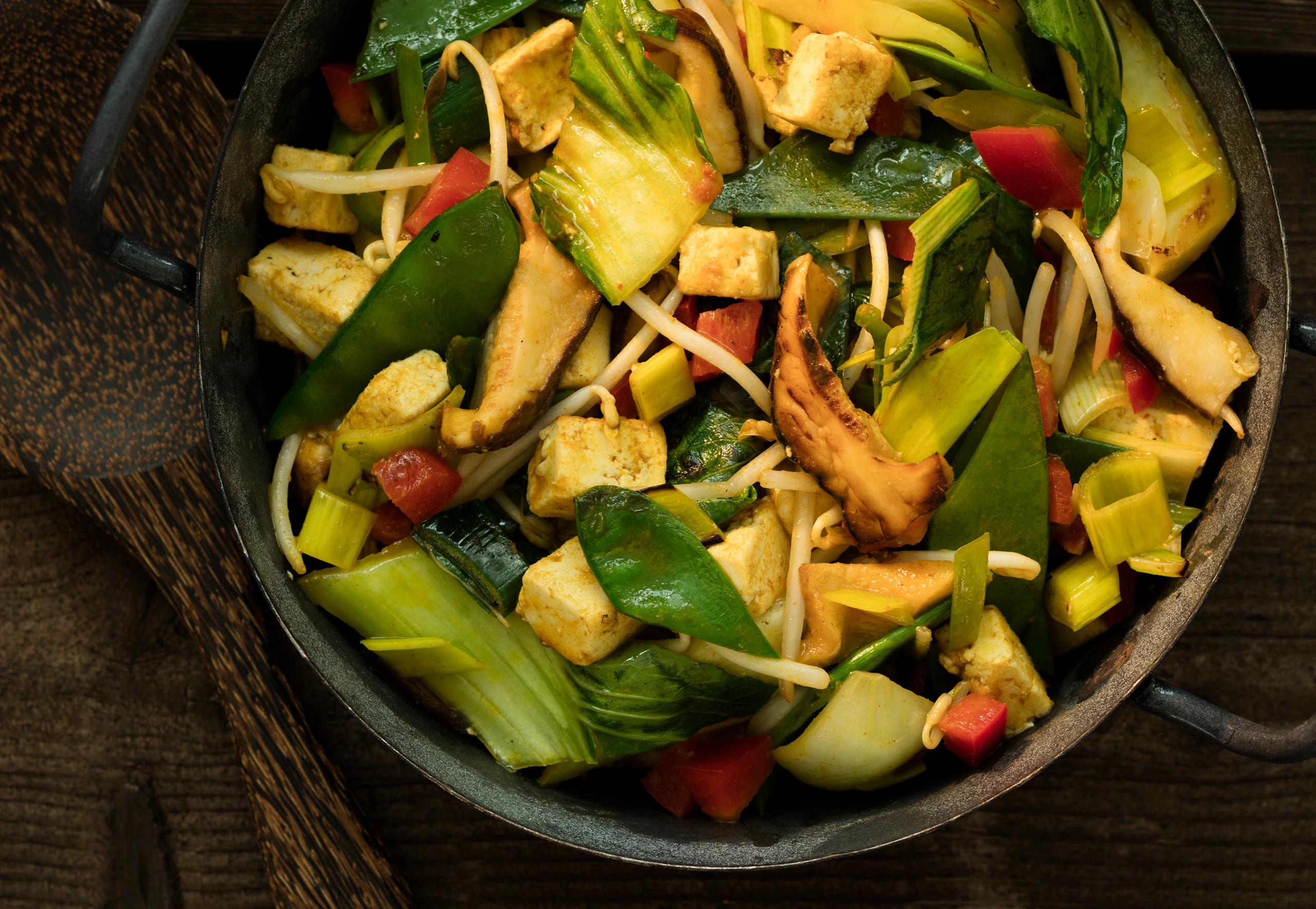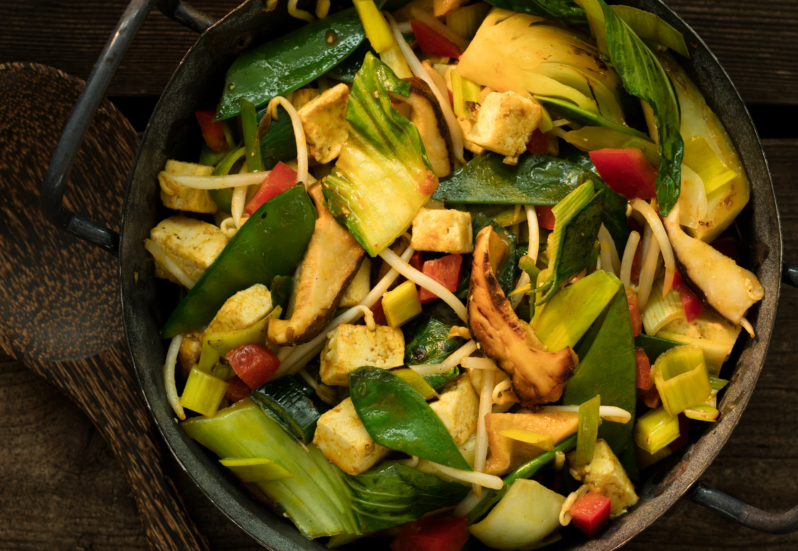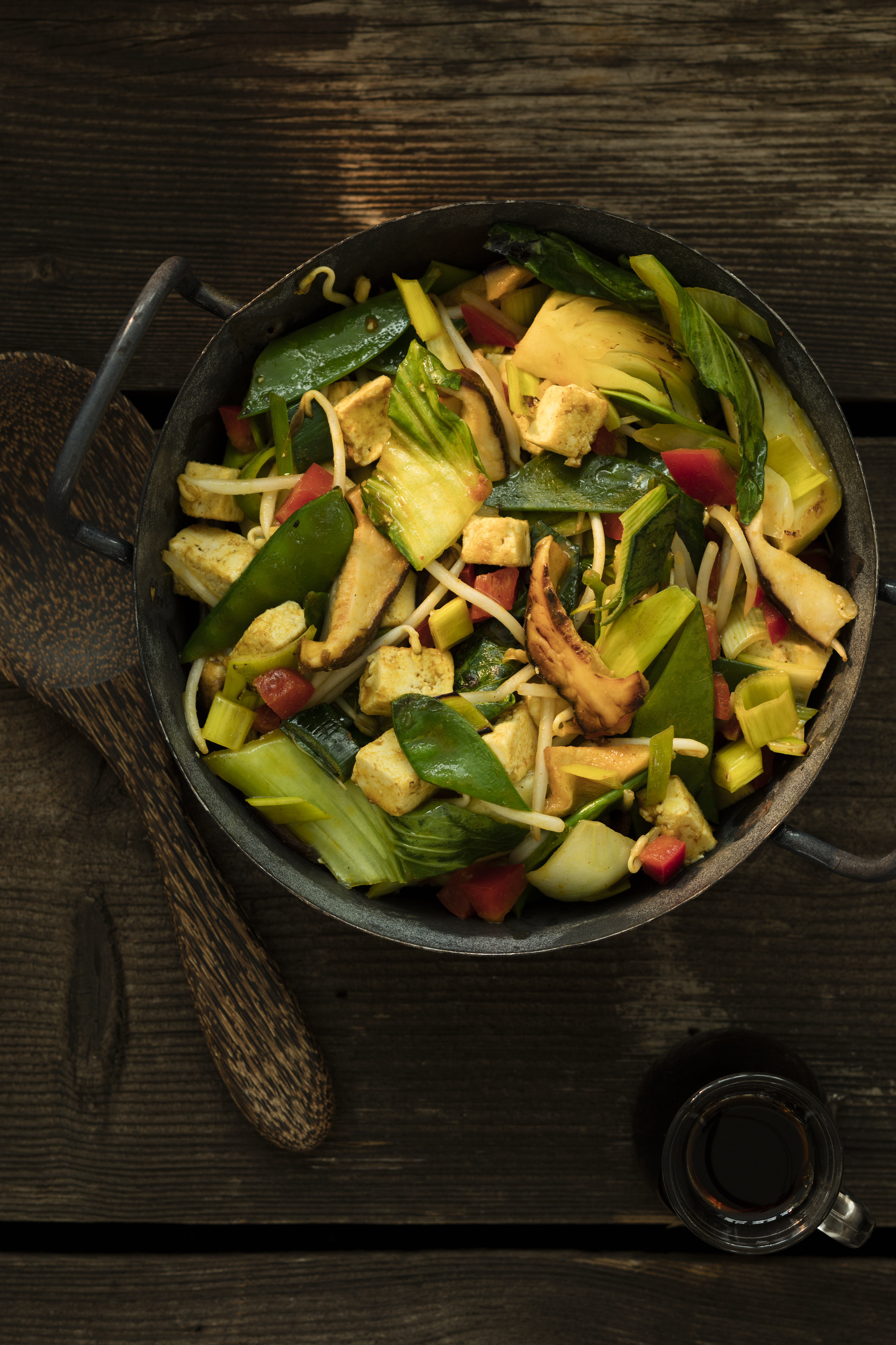 Tofu in Sesamöl anbraten, Erbsenschoten zugeben und kurz mitbraten. Mischung aus der Pfanne nehmen. Im Bratrückstand Paprika, Pak-Choi und Lauch anbraten, Pilze und Sprossen zugeben und mitbraten.