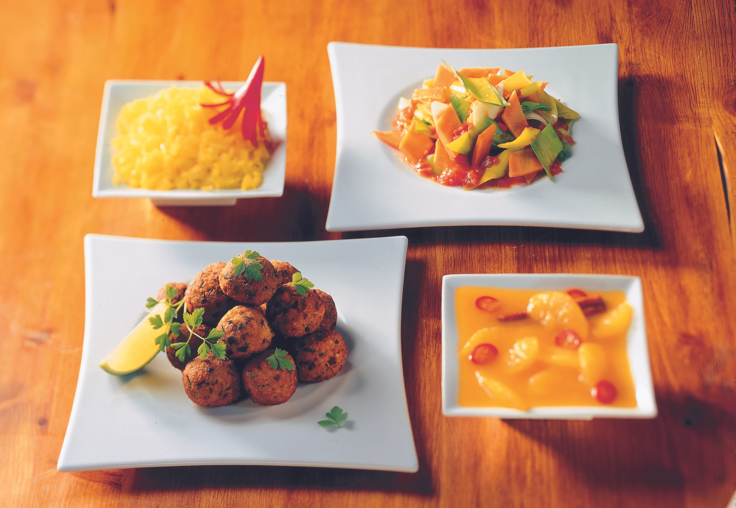 Ca. 3 Finger hoch Öl erhitzen, die Bällchen darin am besten in zwei Arbeitsgängen knusprig backen, herausheben und auf Küchenpapier gut abtropfen lassen. Tofubällchen mit Ananas-Chutney, Lauch-Karotten-Curry und Safranreis anrichten und rasch servieren.