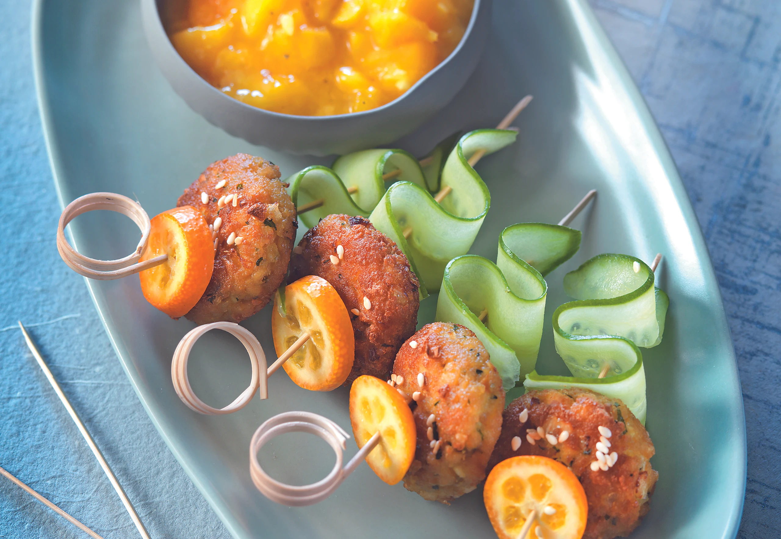 Für die Garnitur Kumquats quer, Gurken längs in dünne Scheiben schneiden. Laibchen, Kumquats und Gurken auf Spießchen stecken, mit Mango-Chutney servieren.