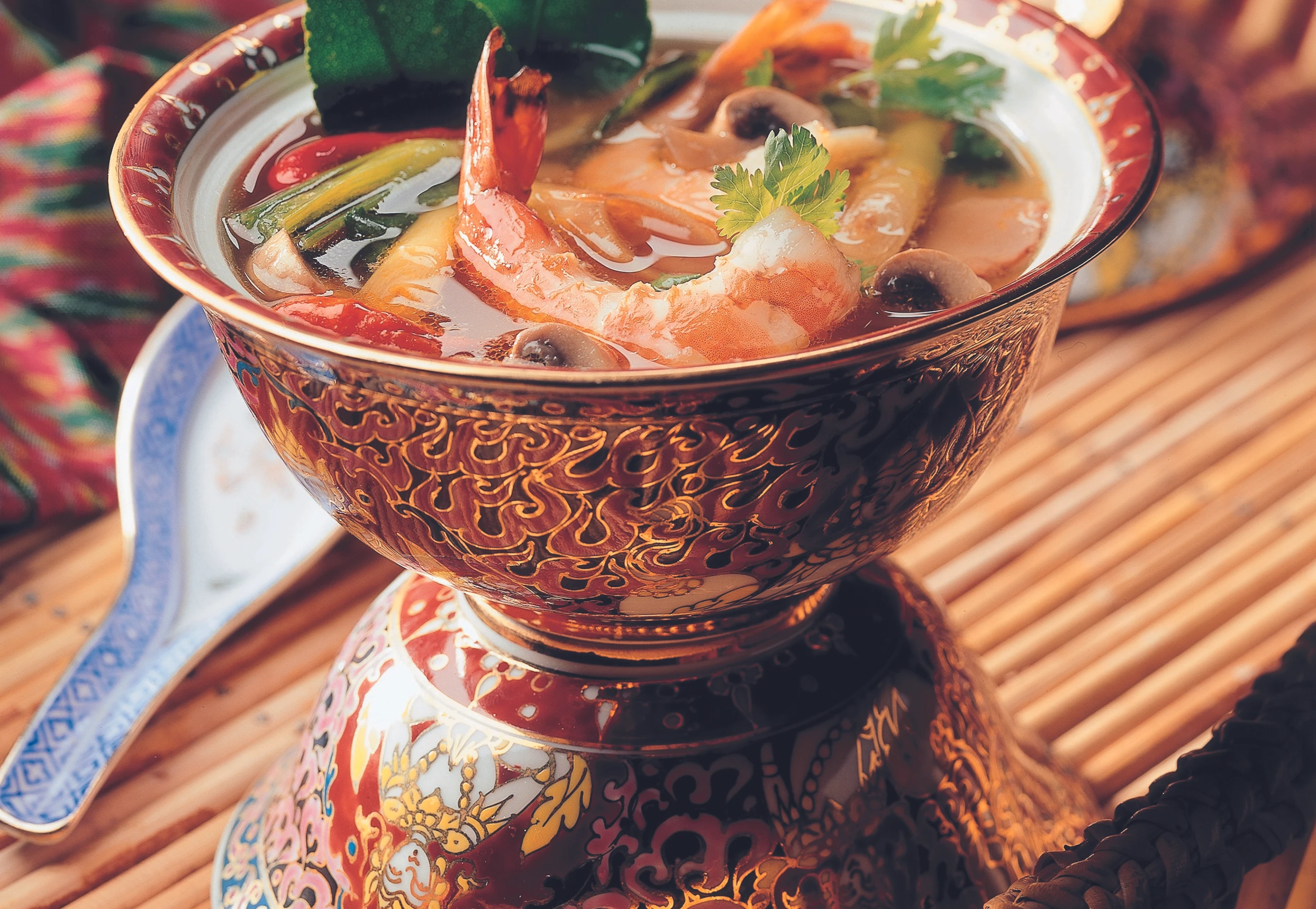 Suppe aufkochen, Zitronengras, Zitronenblätter und Galgant zugeben und ca. 5 Minuten kochen. Garnelen und Champignons untermischen und die Suppe 8 Minuten kochen, mit Fischsauce und Zitronensaft würzen. Korianderblätter, Chilis und Chilipaste einrühren. Suppe am besten in Schalen servieren.