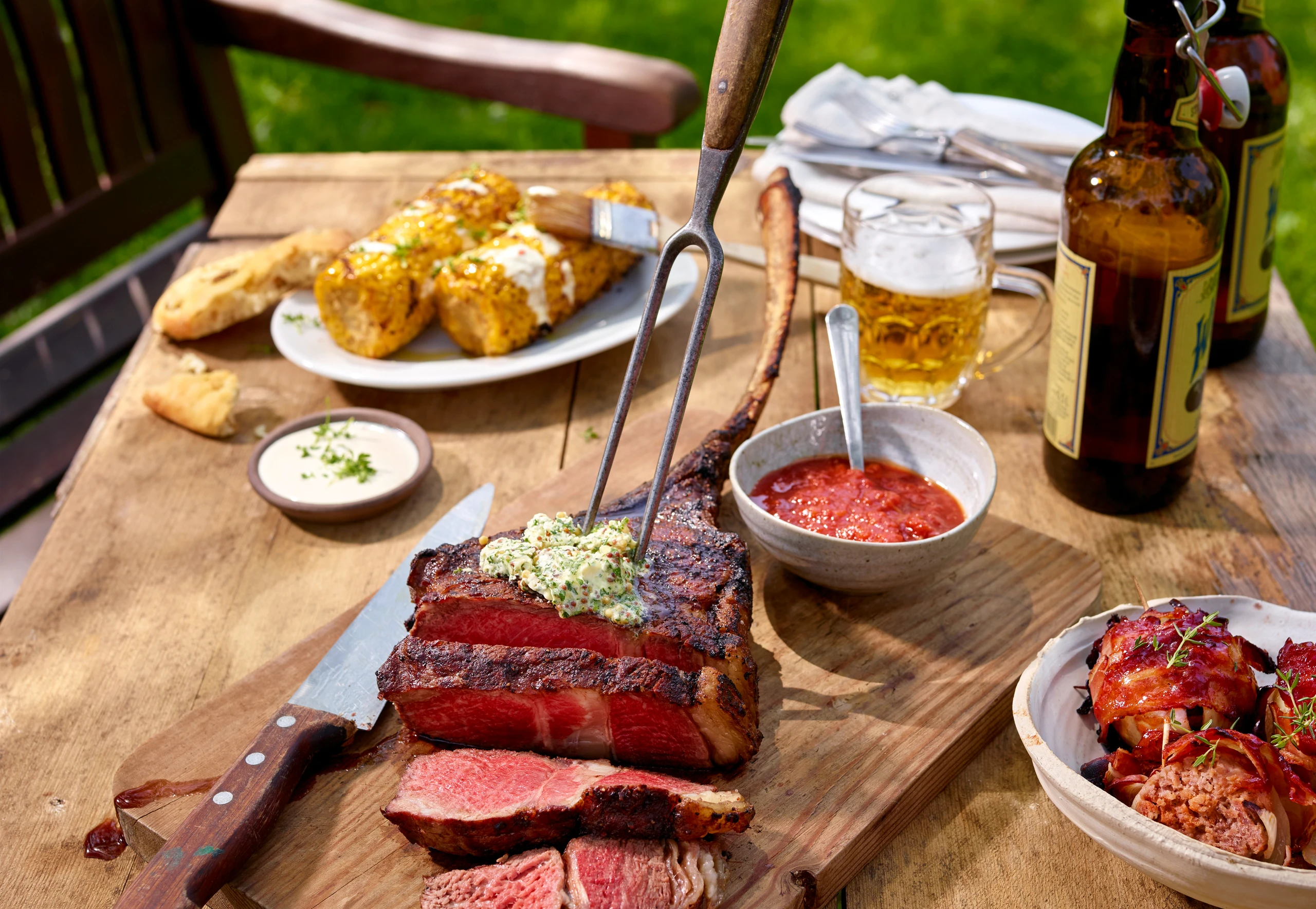 Steak vom Grill nehmen und zugedeckt ca. 5 Minuten rasten lassen. Senf-Chilibutter aus der Folie wickeln und in 2 cm dicke Scheiben schneiden. Steak mit der Butter belegen und mit den Saucen und Maiskolben anrichten.