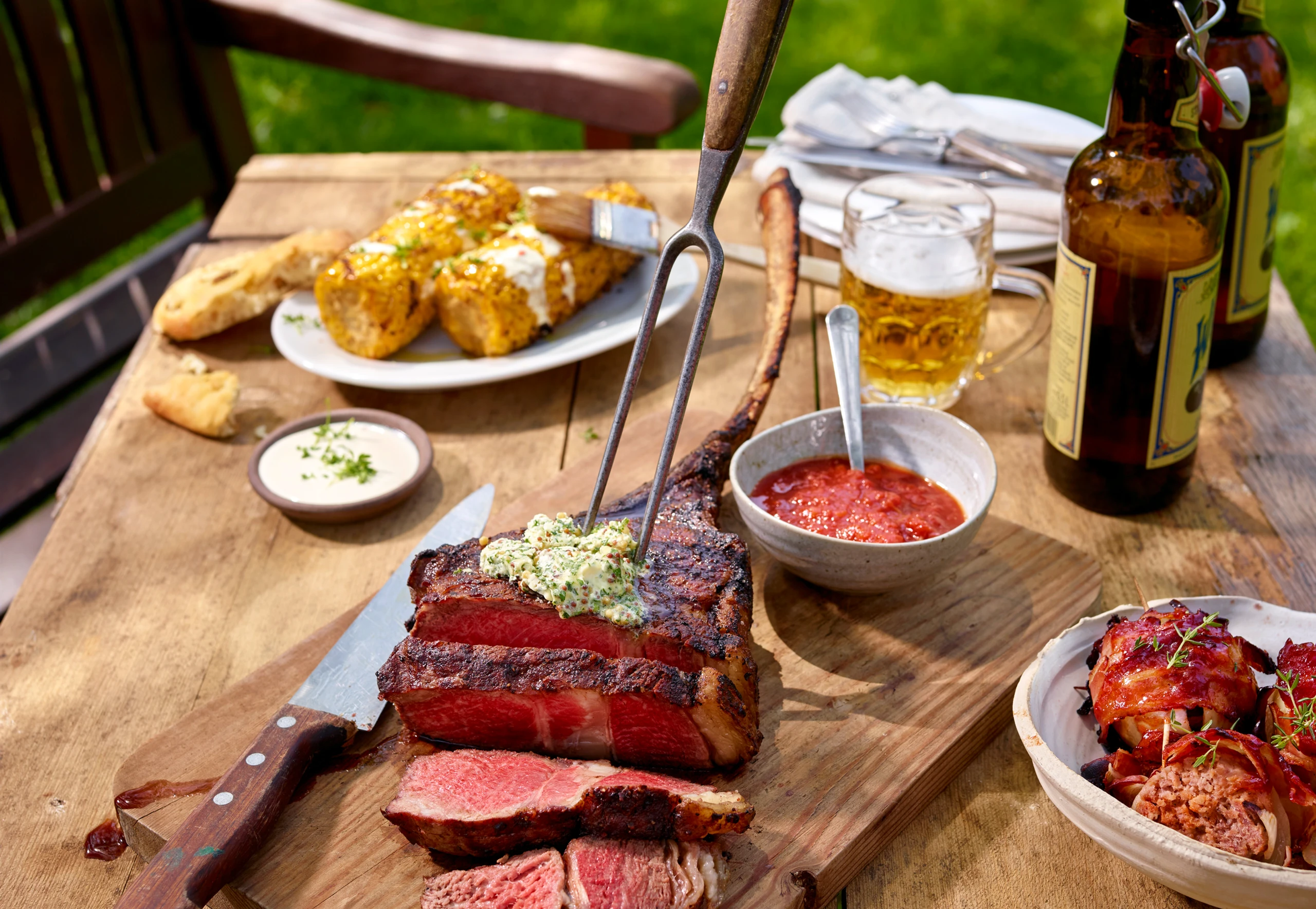 Tomahawk Steak mit Senf-Chilibutter und BBQ-Sauce
