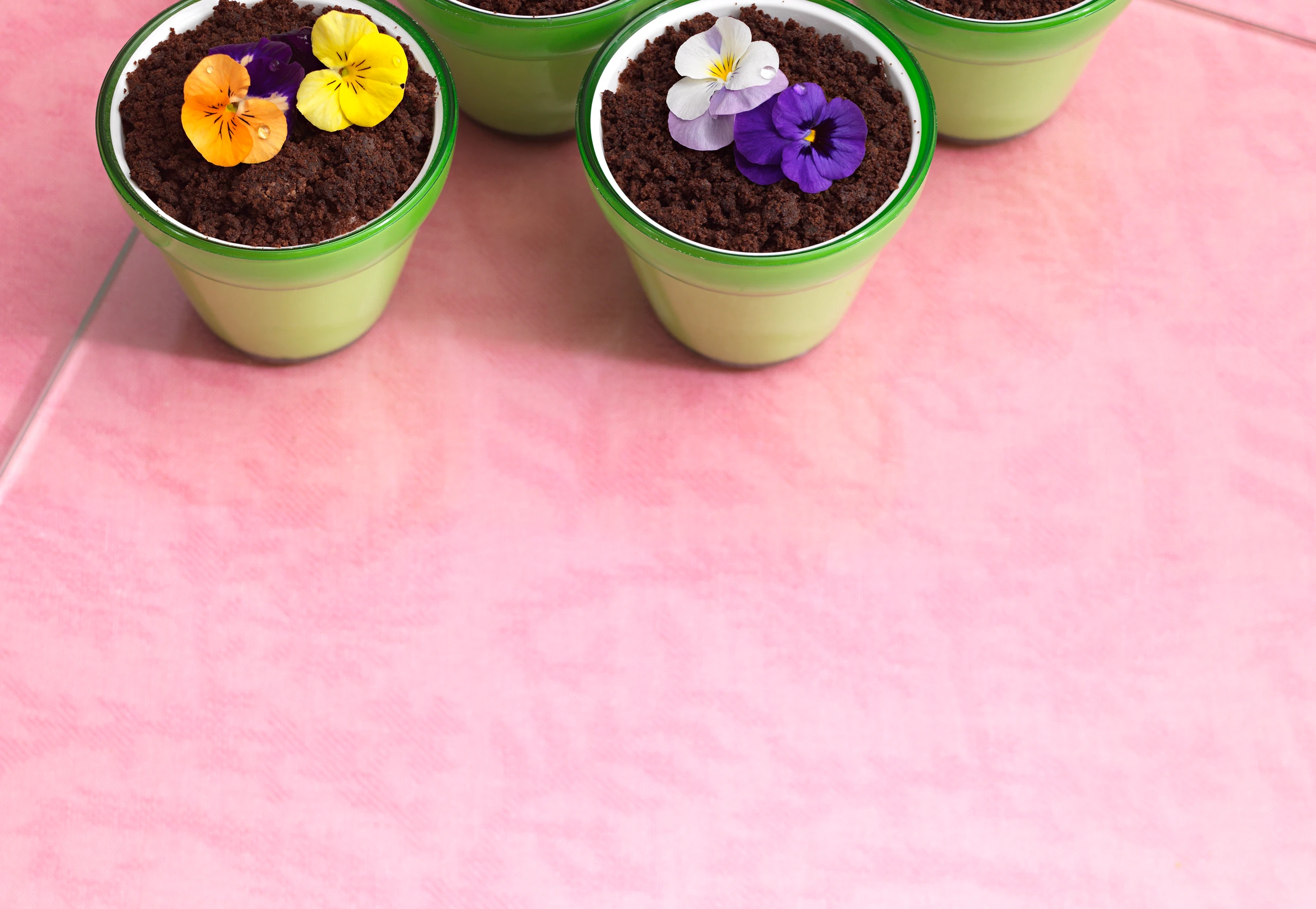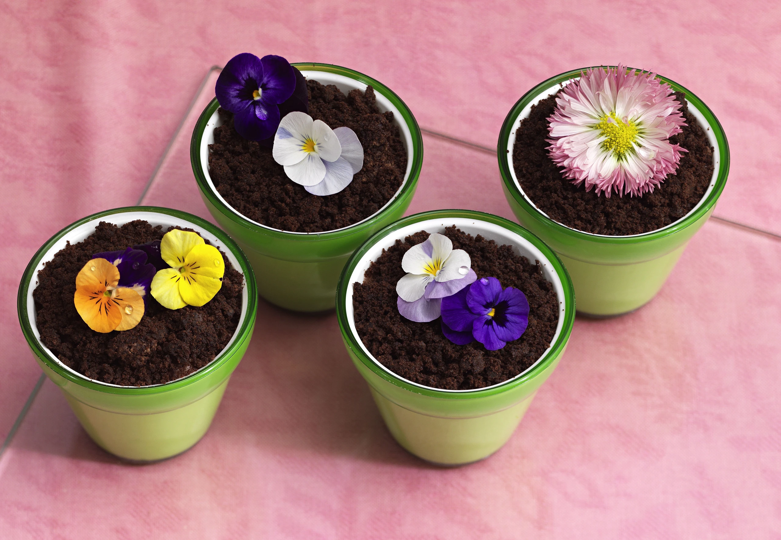- Rhabarberkompott auf der Mousse ver-teilen, mit Schokobiskuit bestreuen und mit Blüten dekorieren.