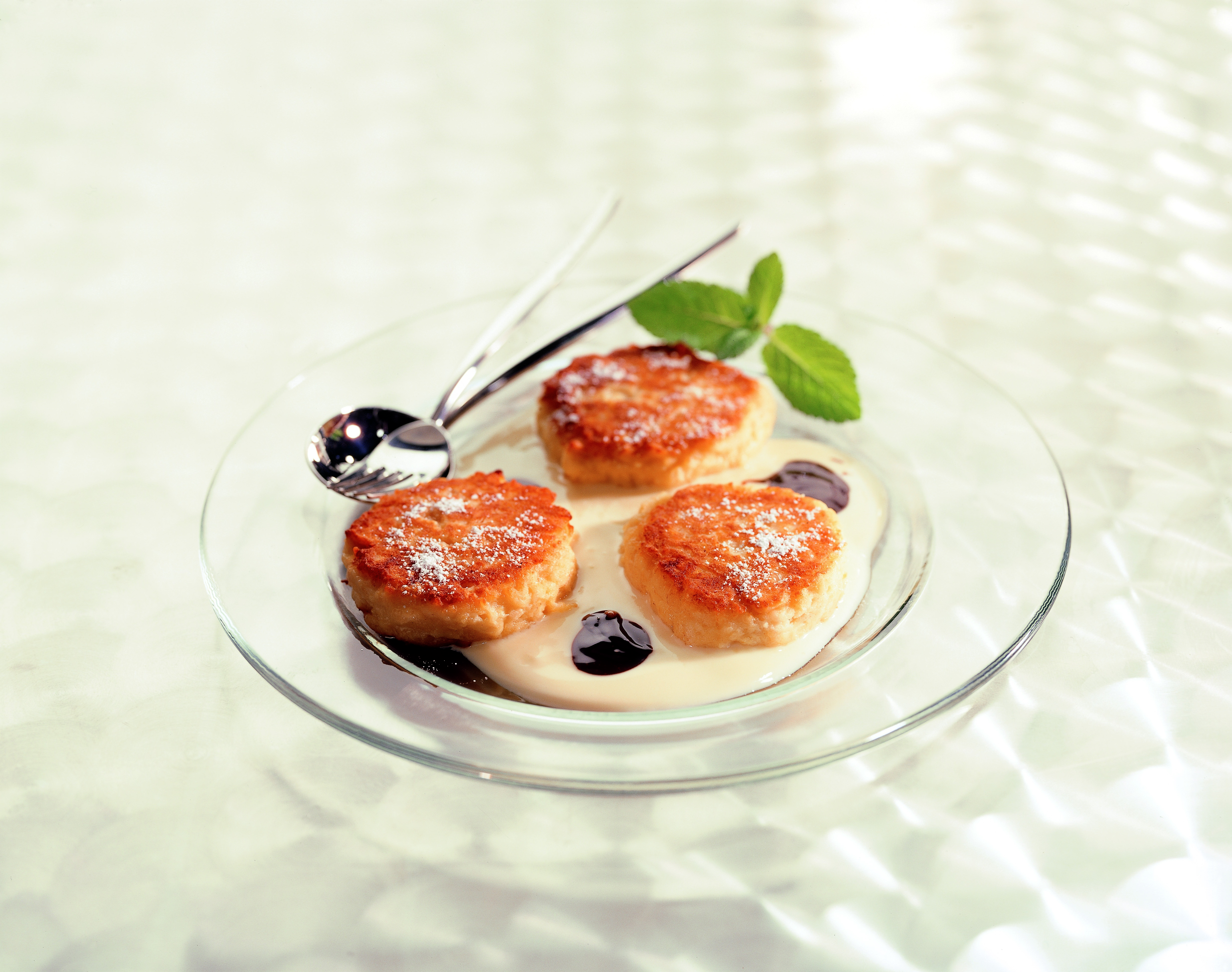 - Ca. 1 Finger hoch Öl erhitzen, Laibchen einlegen und beidseitig goldbraun backen. Laibchen aus der Pfanne heben, auf Küchenpapier gut abtropfen lassen und mit Vanillejoghurt und Schokoladesauce anrichten. Laibchen mit Staubzucker oder Streusüße bestreuen und mit Minze garniert servieren.