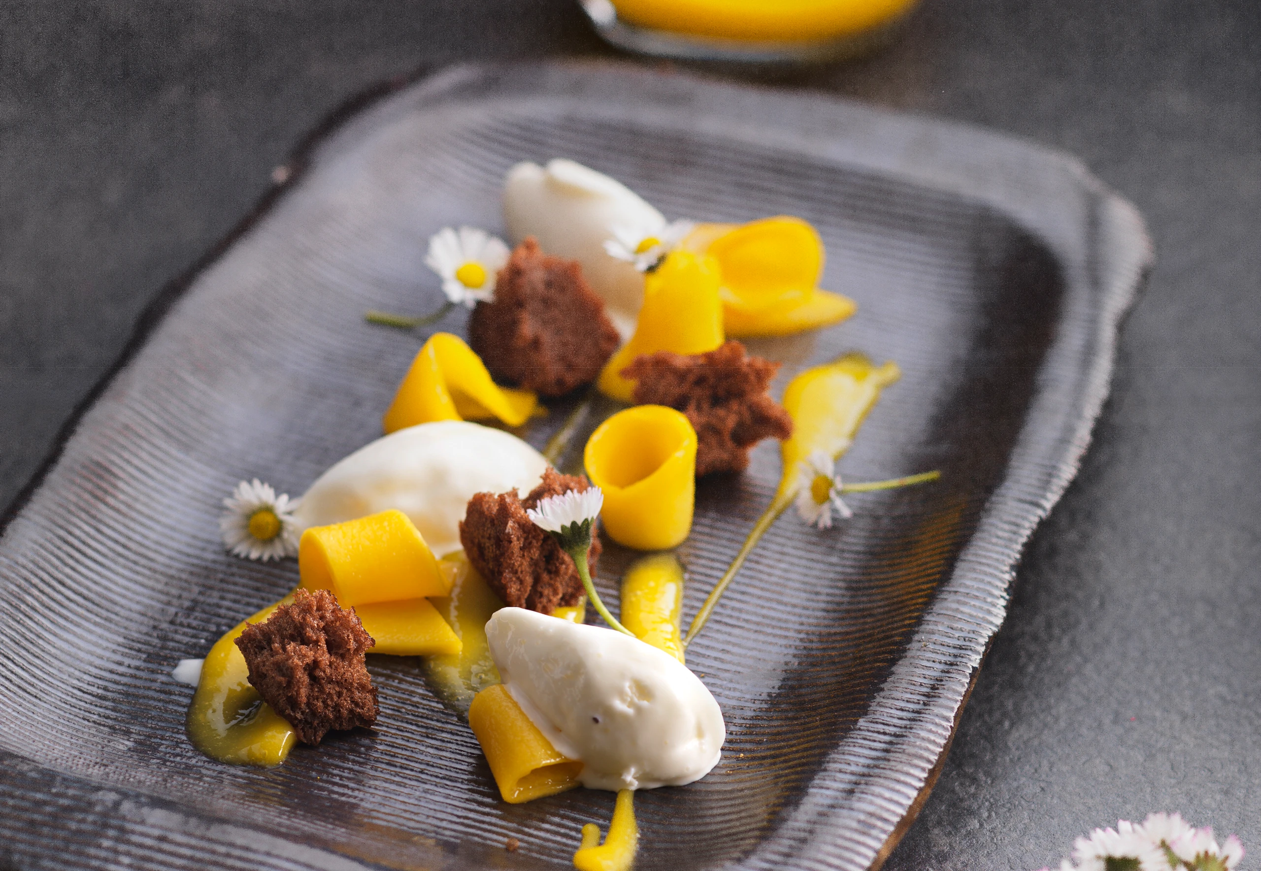 Für die Sauce Mango schälen und das Fruchtfleisch beidseitig vom Kern schneiden. Die Hälfte davon mit Staub-zucker pürieren und passieren. Übriges Fruchtfleisch in Scheiben, dann in Streifen schneiden. Kuchen in kleine Stücke teilen. Aus dem Topfeneis mit einem Löffel Nocken formen und mit Kuchenstücken anrichten. Mit Mangostreifen, Mango-sauce und Gänse-blümchen garnieren.