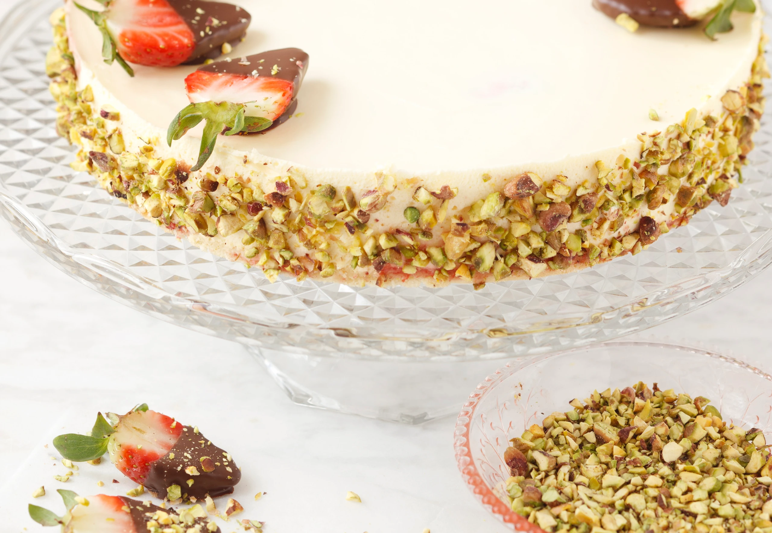 Für die Garnitur Erdbeeren mit Grün längs halbieren, in die Kuvertüre tauchen, auf Backpapier setzen und mit Pistazien bestreuen. Kuvertüre fest werden lassen. Tortenrand mit Pistazien einstreuen und mit den getunkten Erdbeeren garnieren.