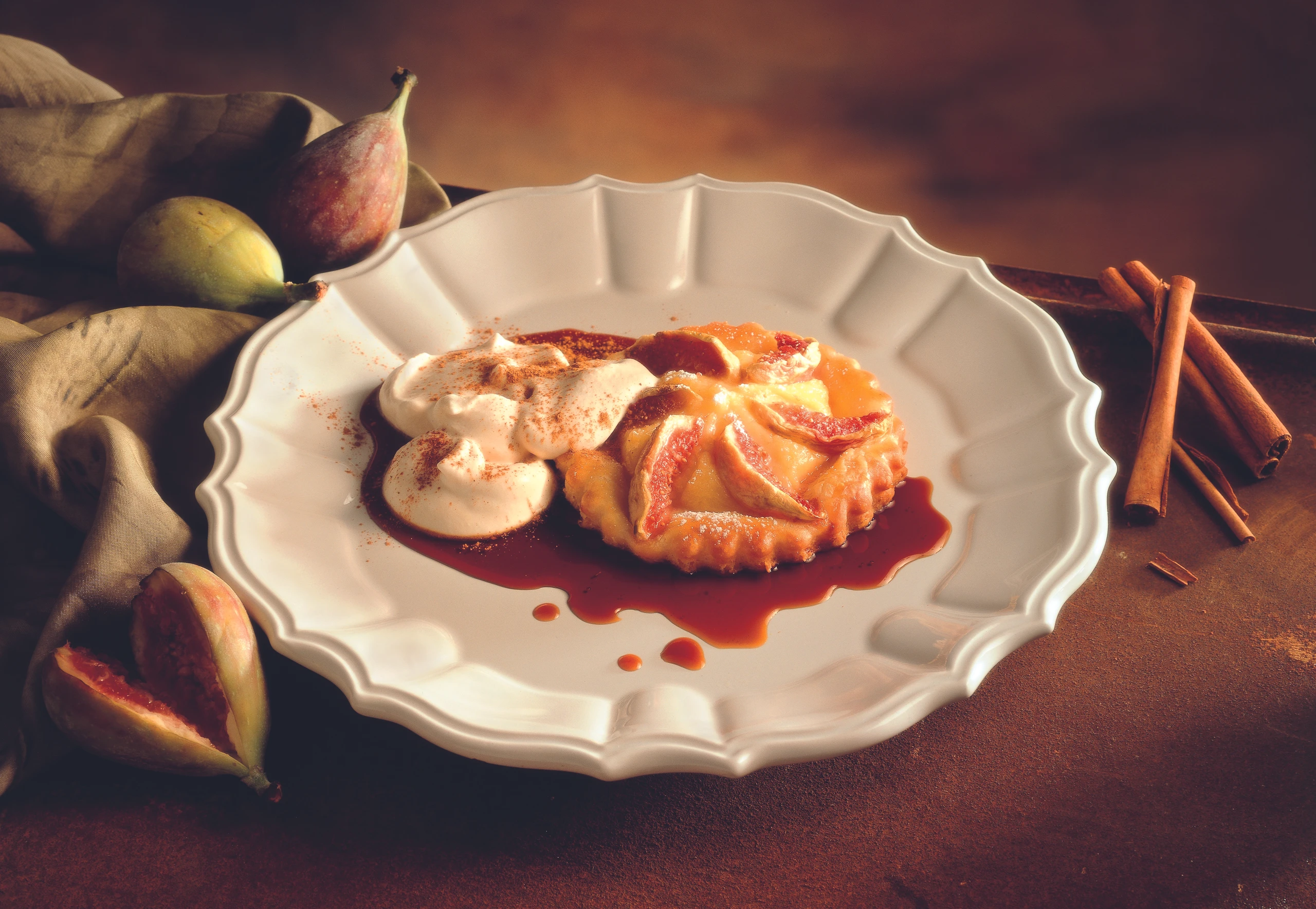 Feigentörtchen aus dem Rohr nehmen und mit Obers und Karamellsauce anrichten. Obers vor dem Servieren mit Zimt bestreuen.