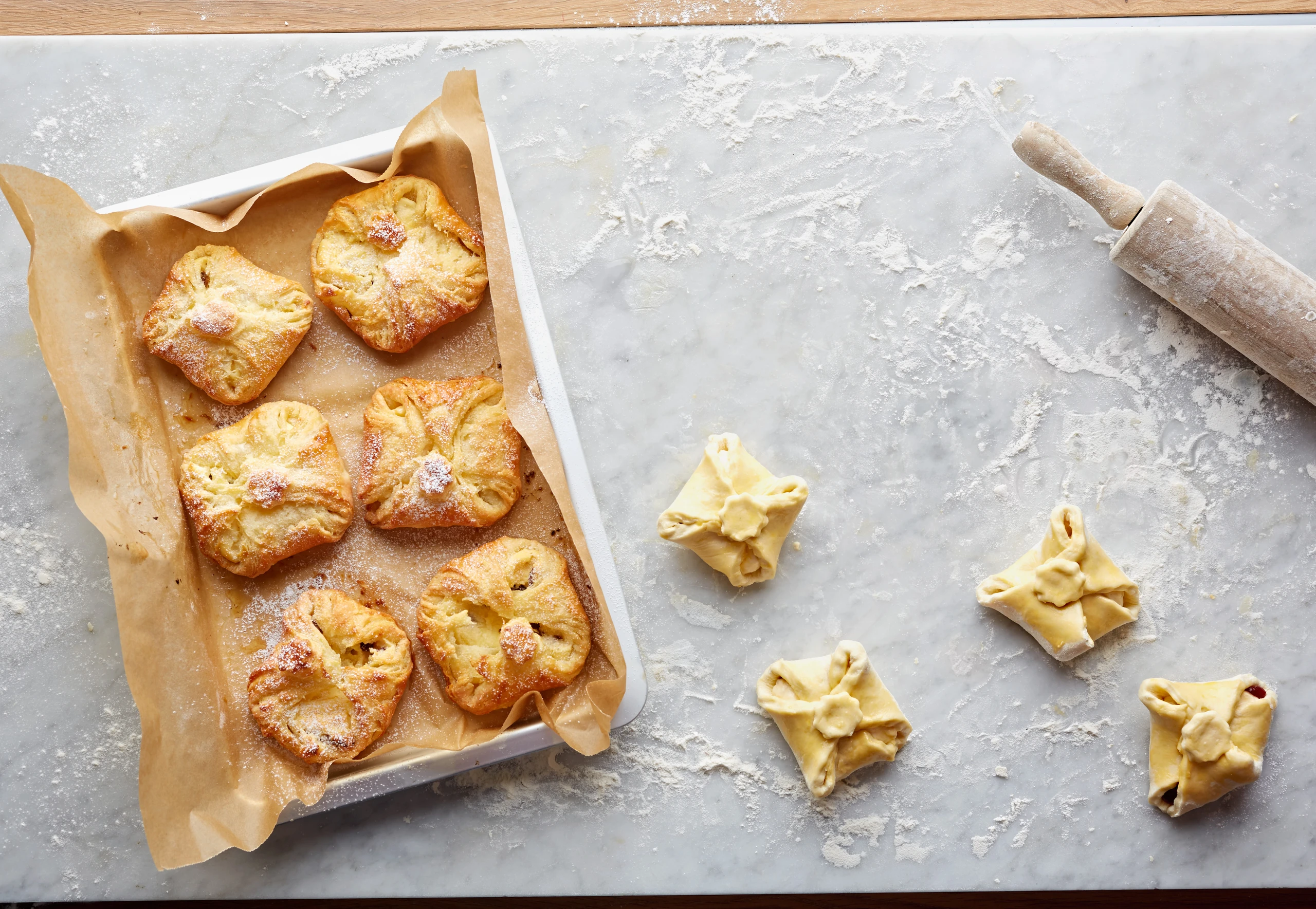- Teig halbieren, auf einer bemehlten Arbeitsfläche 50 x 30 cm groß ausrollen.