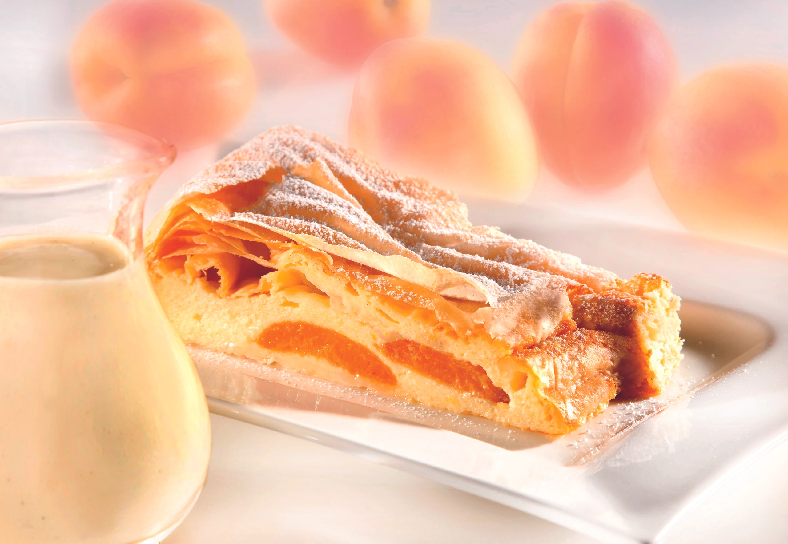 Rohr auf 160°C vorheizen. Backblech mit Backpapier belegen. Ein Strudelblatt auf ein feuchtes Tuch legen, mit Butter bestreichen, zweites Strudelblatt darauflegen und ebenfalls mit Butter bestreichen. Fülle auf einer Teighälfte verstreichen und mit Marillen belegen. Teig über die Fülle eng einrollen.