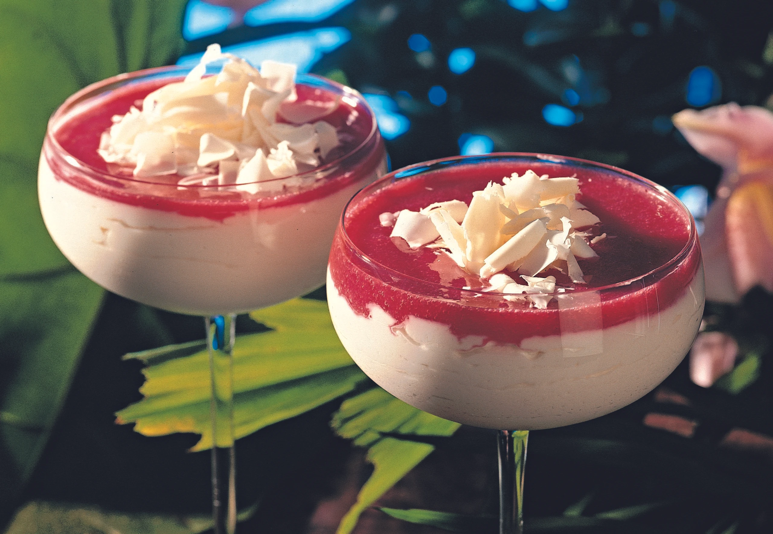 Himbeerpüree auf den Cremeportionen verteilen und zum Festwerden ca. 1/2 Stunde in den Kühlschrank stellen.
