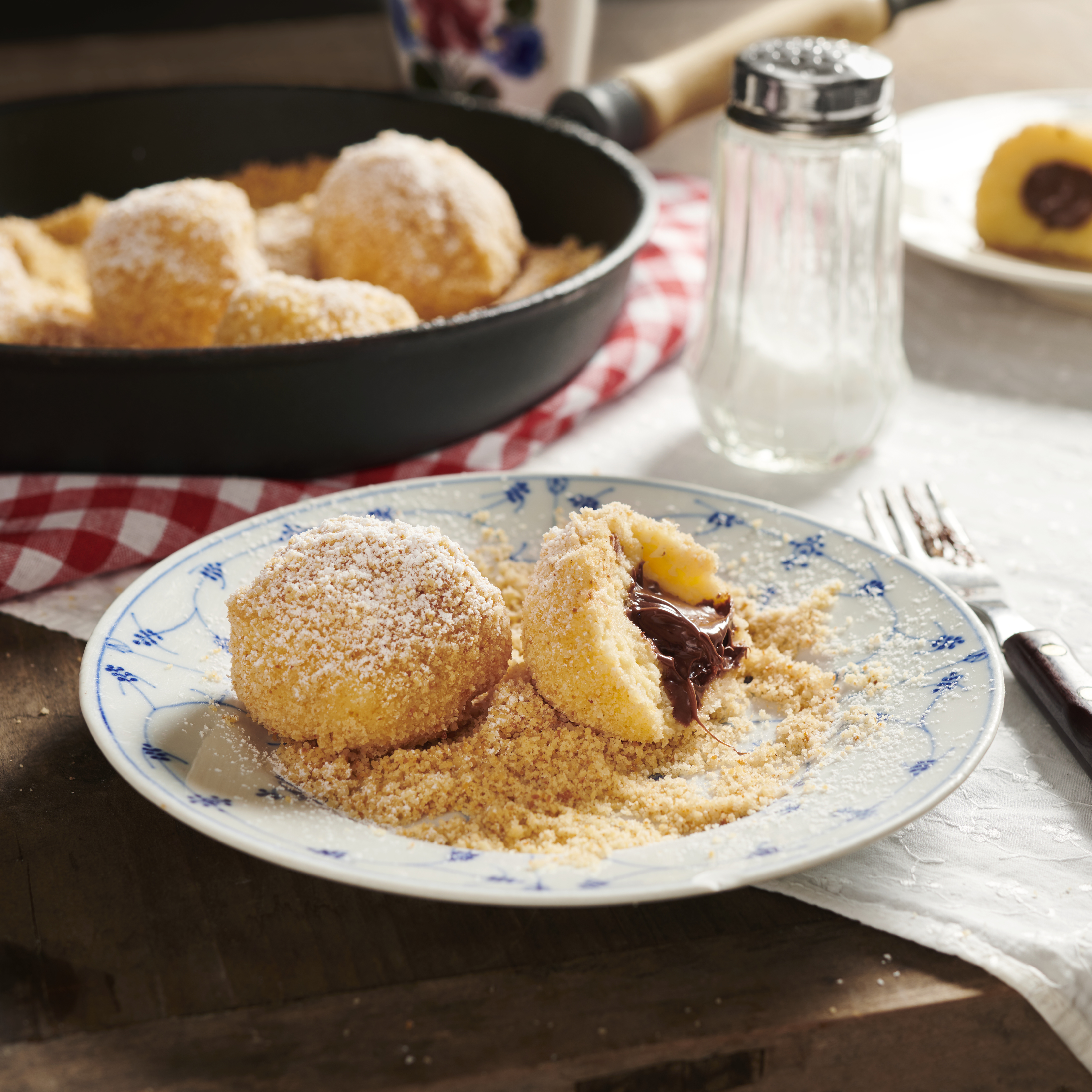 Nougat in 12 Würfel schneiden. 1 EL Teig flach drücken, mit Nougat füllen und zu einem Knödel formen. 11 weitere Knödel formen.