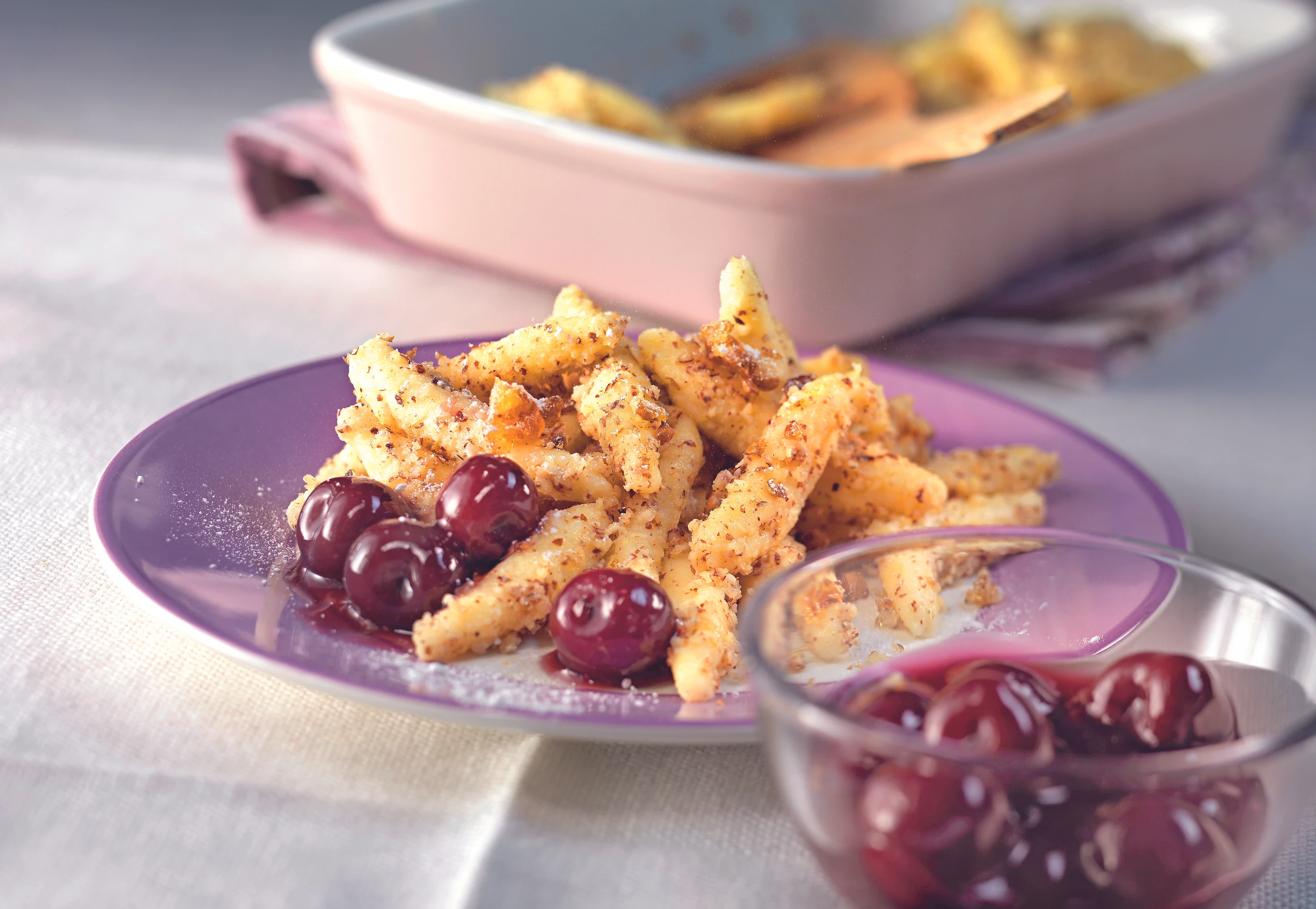 Topfen-Nussnudeln mit Kirschen