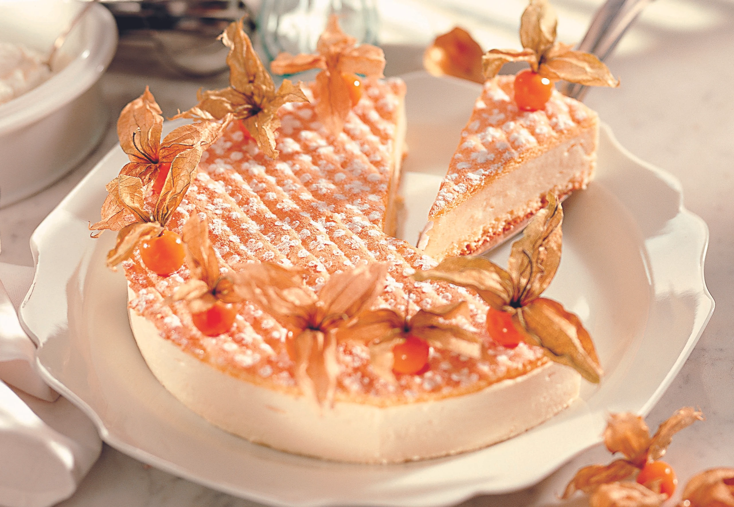 - Torte mit einem Messer vom Rand der Form lösen. Form öffnen und den Tortenreifen abheben. Torte mit Staubzucker bestreuen und mit Erdkirschen dekorieren.