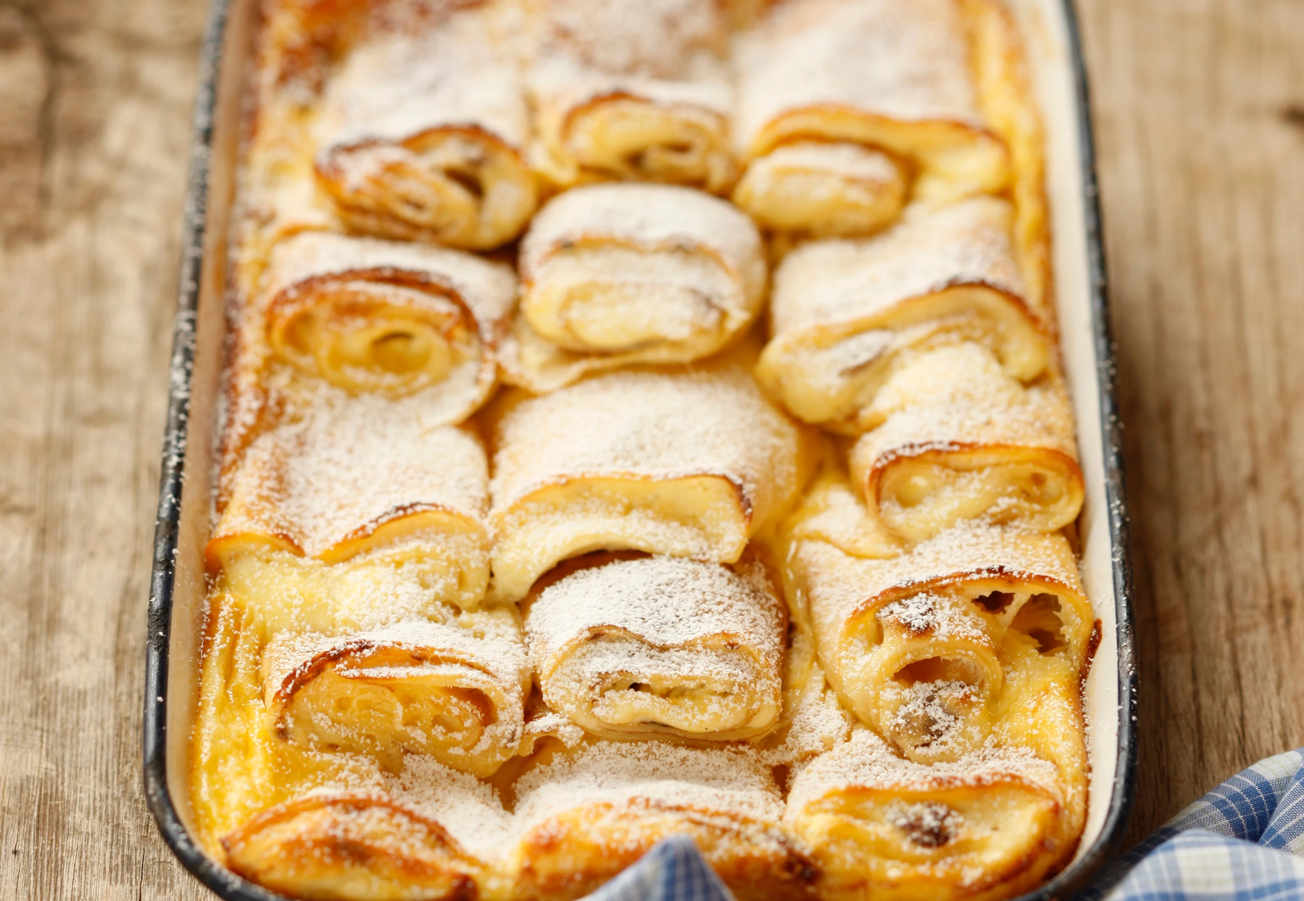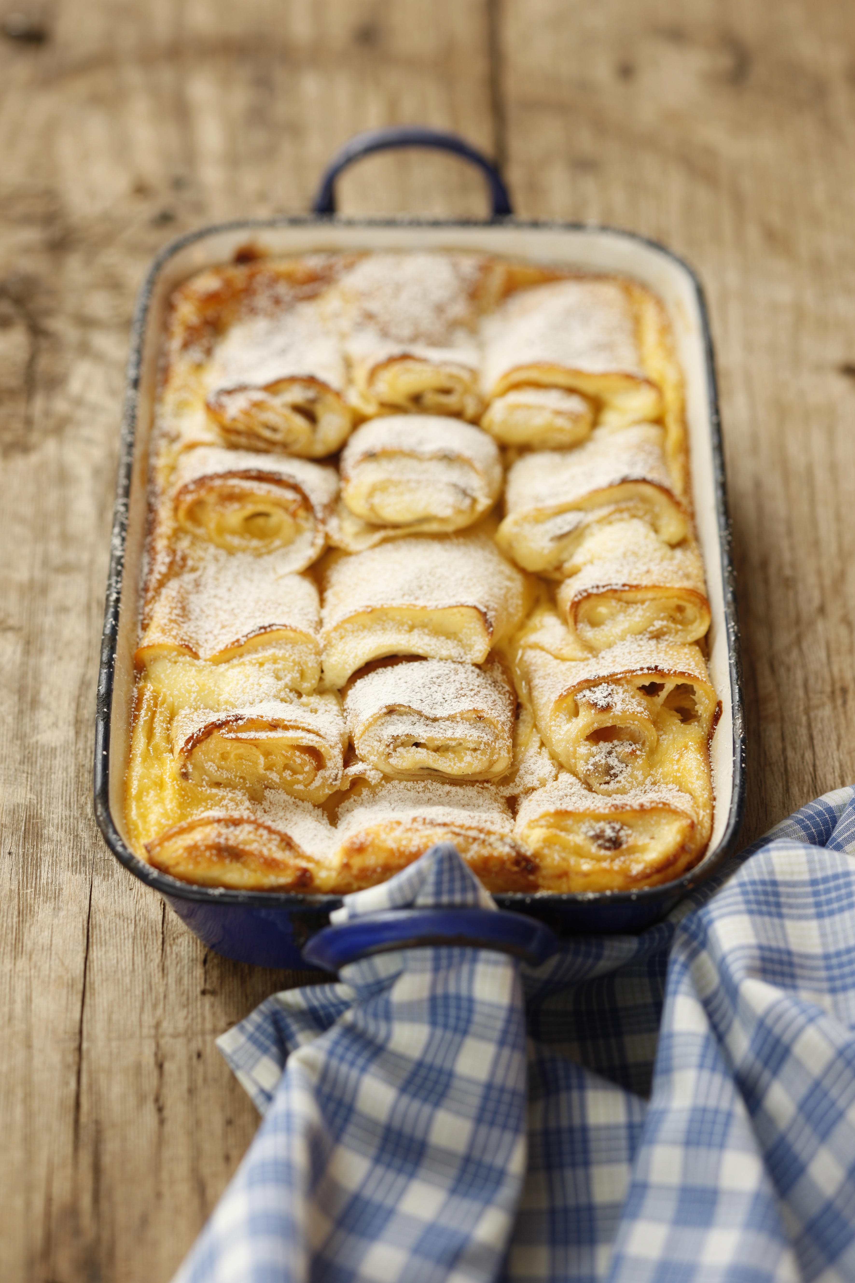 Für den Überguss alle Zutaten verquirlen und über die Palatschinken gießen. Palatschinken noch ca. 35 Minuten backen. Mit Staubzucker bestreut servieren.