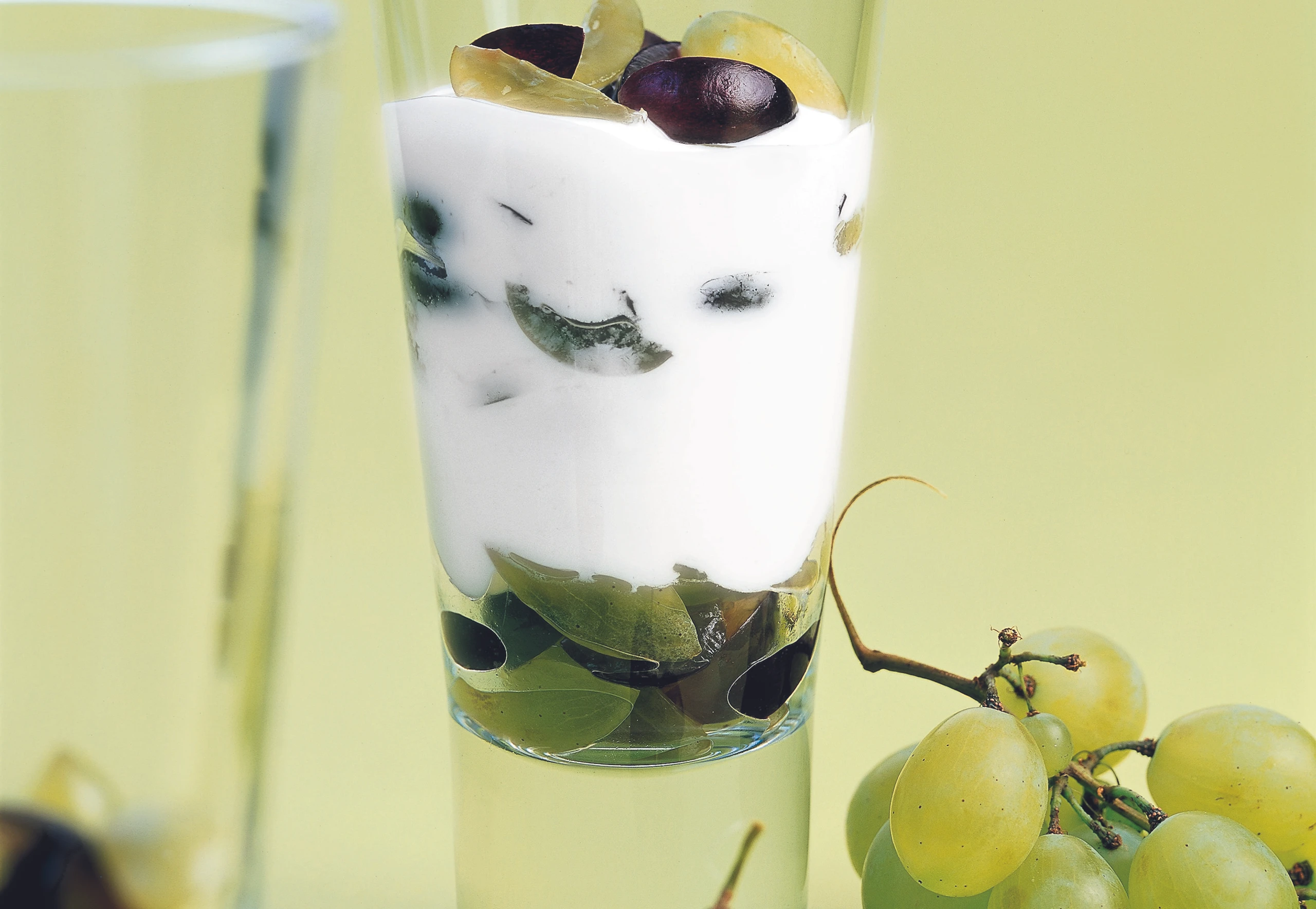 Topfencreme und Trauben abwechselnd in die Gläser füllen und servieren.