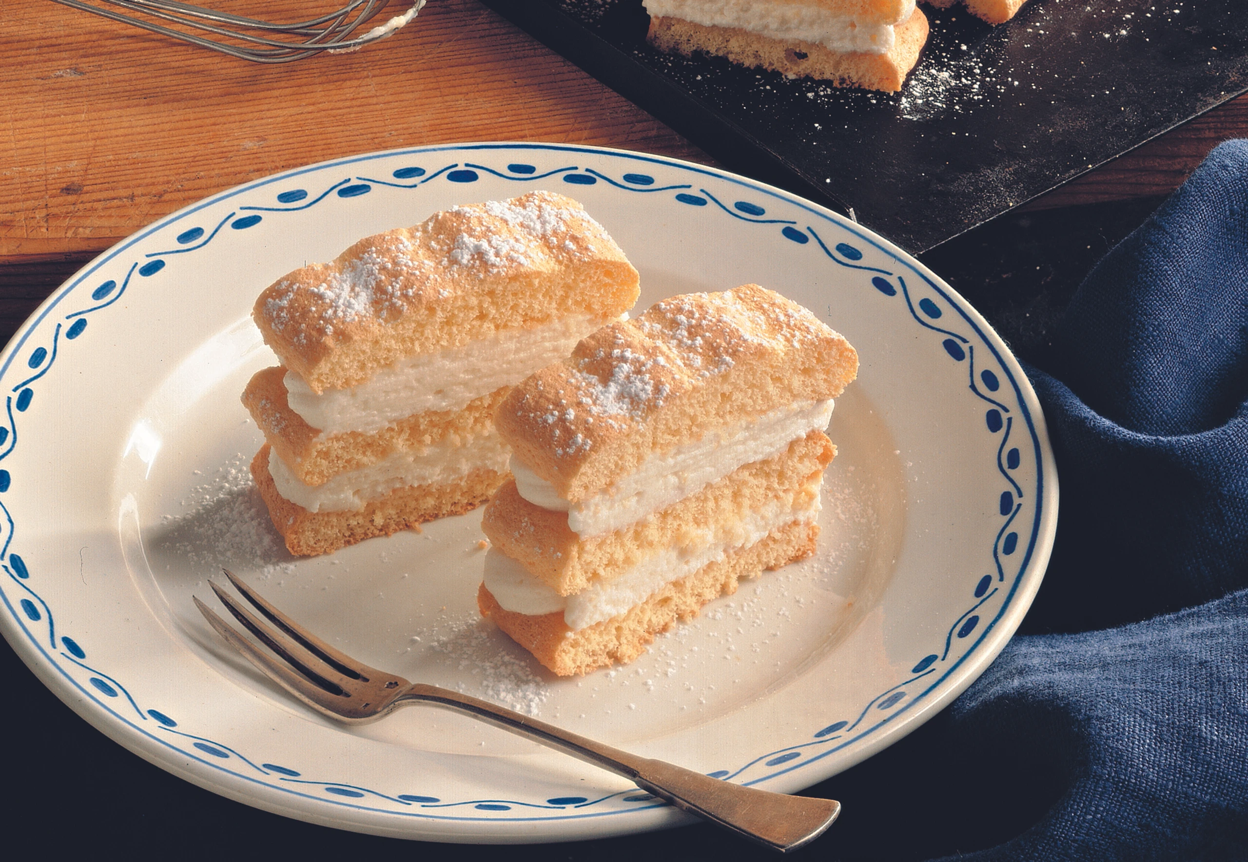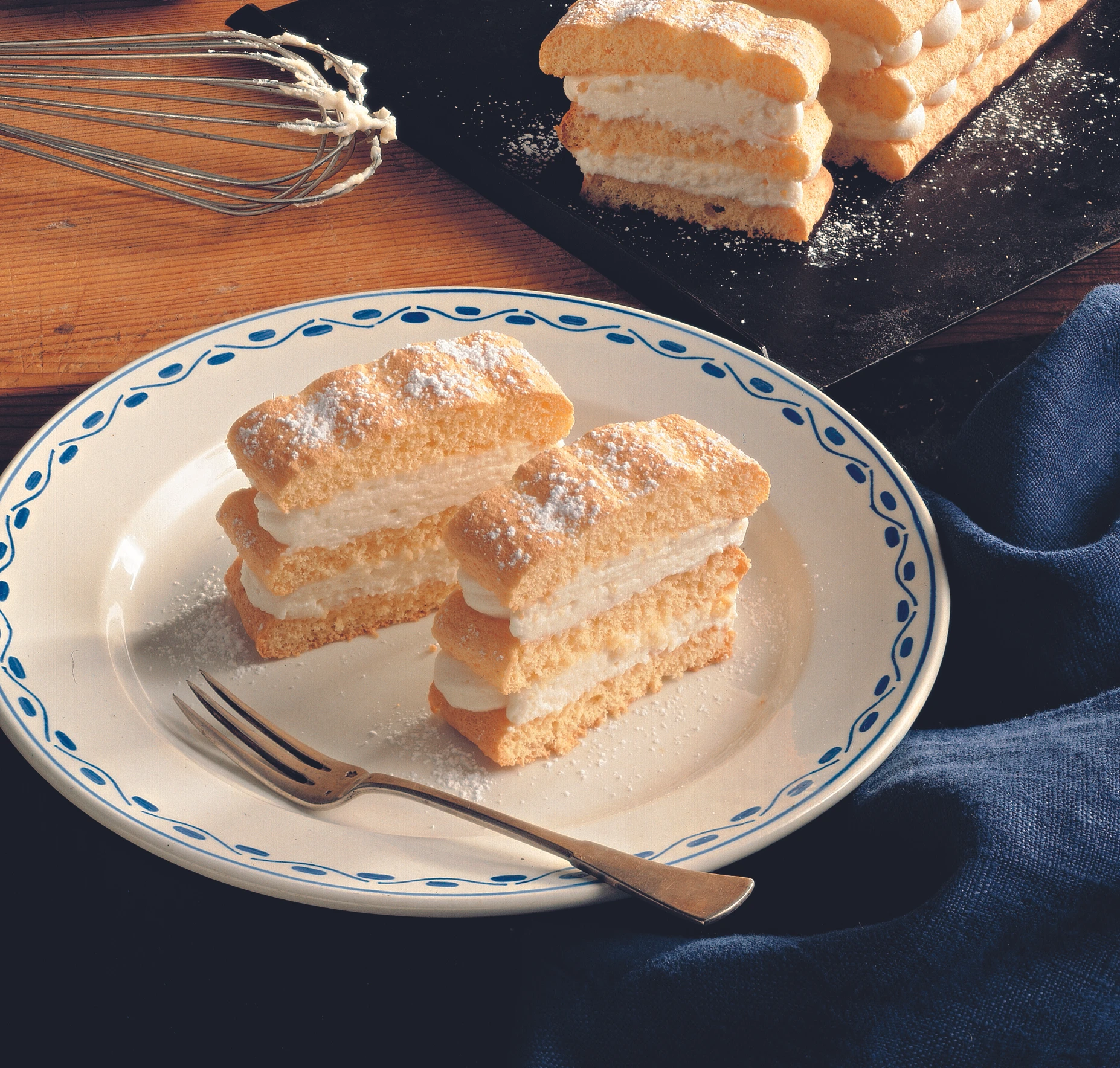 Biskuit im Rohr (mittlere Schiene) hellbraun backen (ca. 12 Minuten), herausnehmen, auskühlen lassen und die Streifen vom Papier lösen.