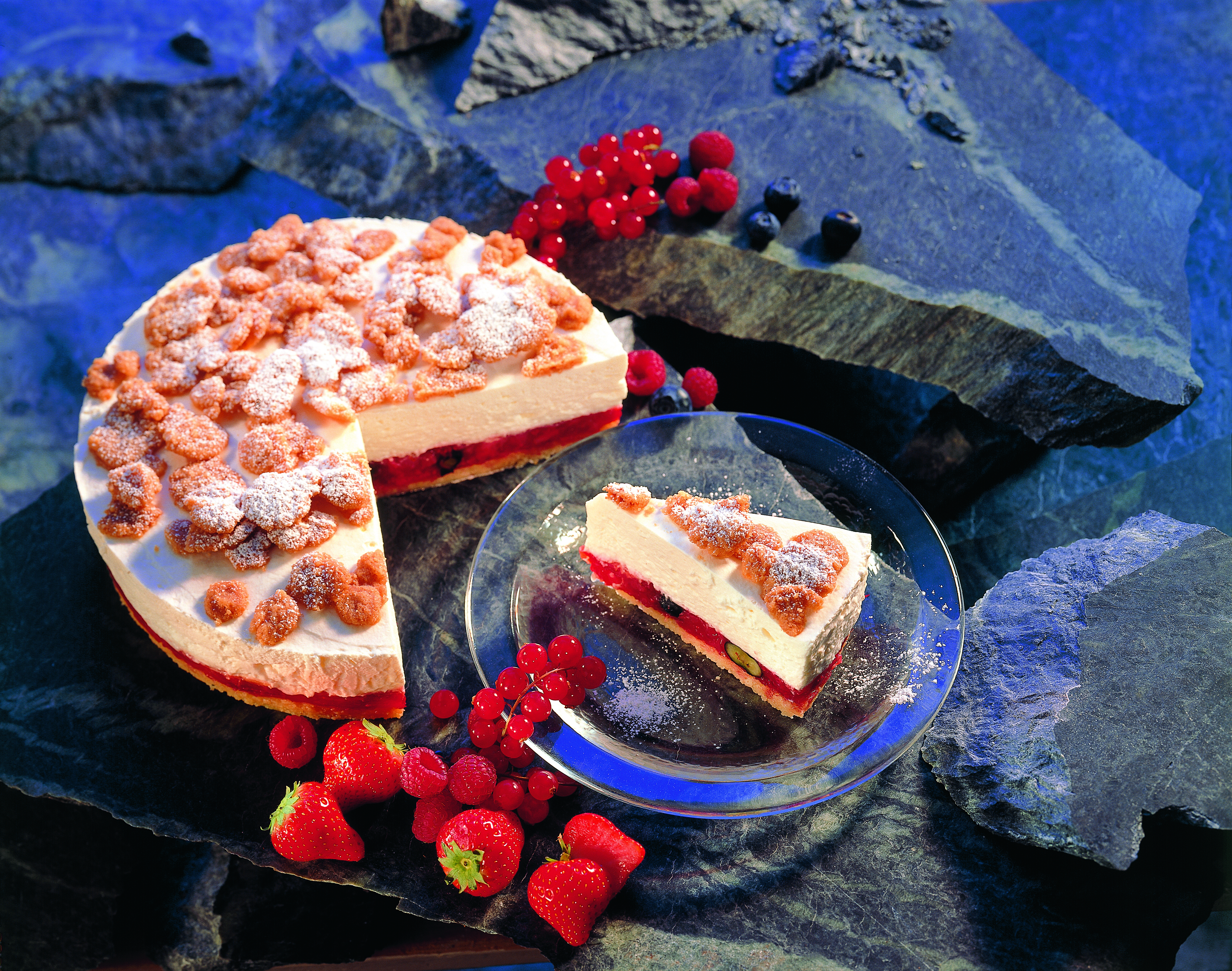 Torte aus der Form lösen, mit Streusel dekorativ garnieren und mit Staubzucker bestreut servieren.