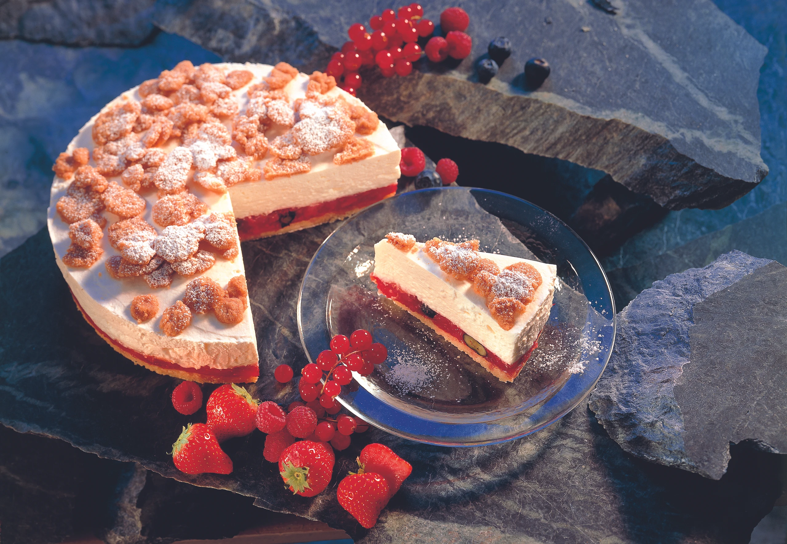 Gelatine in kaltem Wasser einweichen. Obers halbfest schlagen und kalt stellen. Eiklar mit Kristallzucker zu cremigem Schnee schlagen. Holunderblütensirup erwärmen, Gelatine ausdrücken, darin auflösen und rasch in die Topfenmasse rühren. Obers und Eischnee unterheben. Creme in die Form füllen und gleichmäßig auf der Beerengrütze verstreichen. Torte mit Frischhaltefolie zudecken und ca. 8 Stunden kühlen.