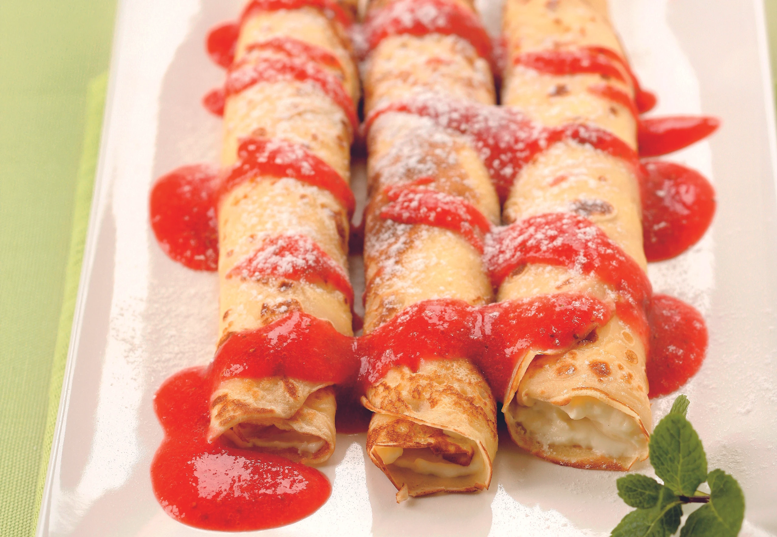 Aus dem Teig in wenig Öl Palatschinken backen, mit Fülle bestreichen, einrollen und mit der Erdbeersauce anrichten. Mit wenig Staubzucker bestreuen.