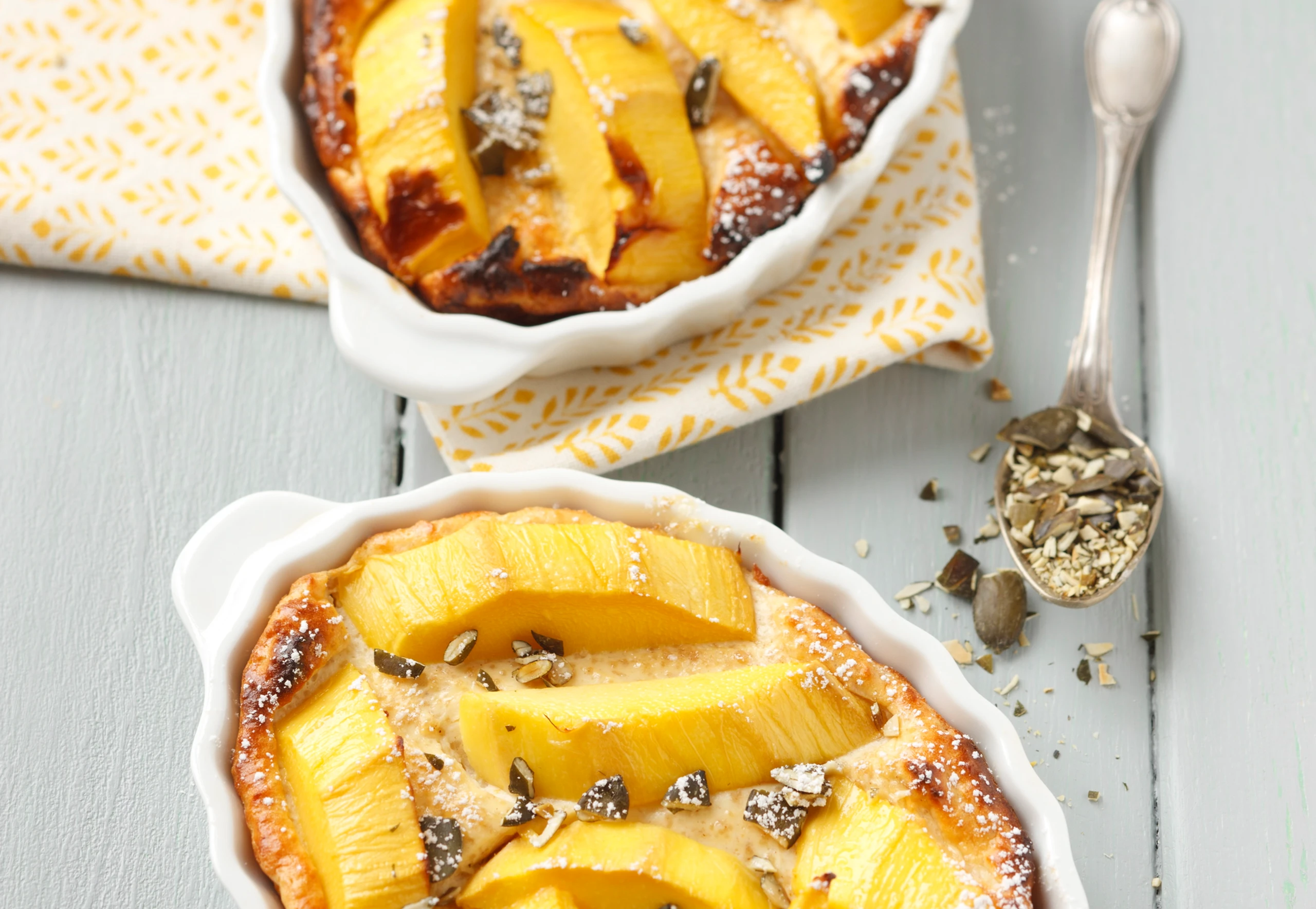 Masse in die Formen füllen, mit Mangostücken belegen und im Rohr (mittlere Schiene / Gitterost) ca. 50 Minuten backen. Aufläufe mit Kürbiskernen und Staubzucker bestreut servieren.