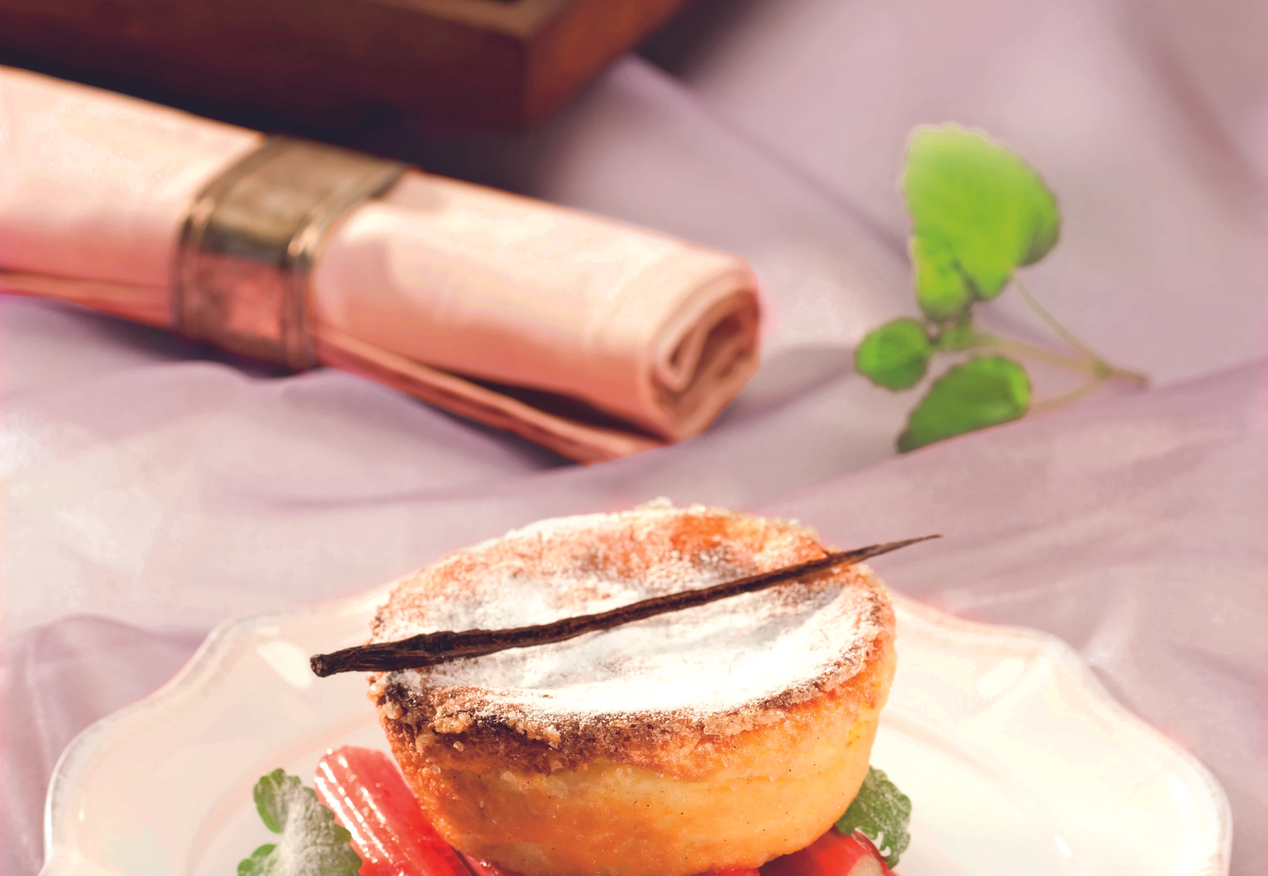 - Masse in die Förmchen füllen und im Rohr (mittlere Schiene / Gitterrost) ca. 15 Minuten backen. Aufläufe aus dem Rohr nehmen und auf Teller stürzen. Mit Staubzucker bestreuen, mit Rhabarber und Melisse garniert servieren.